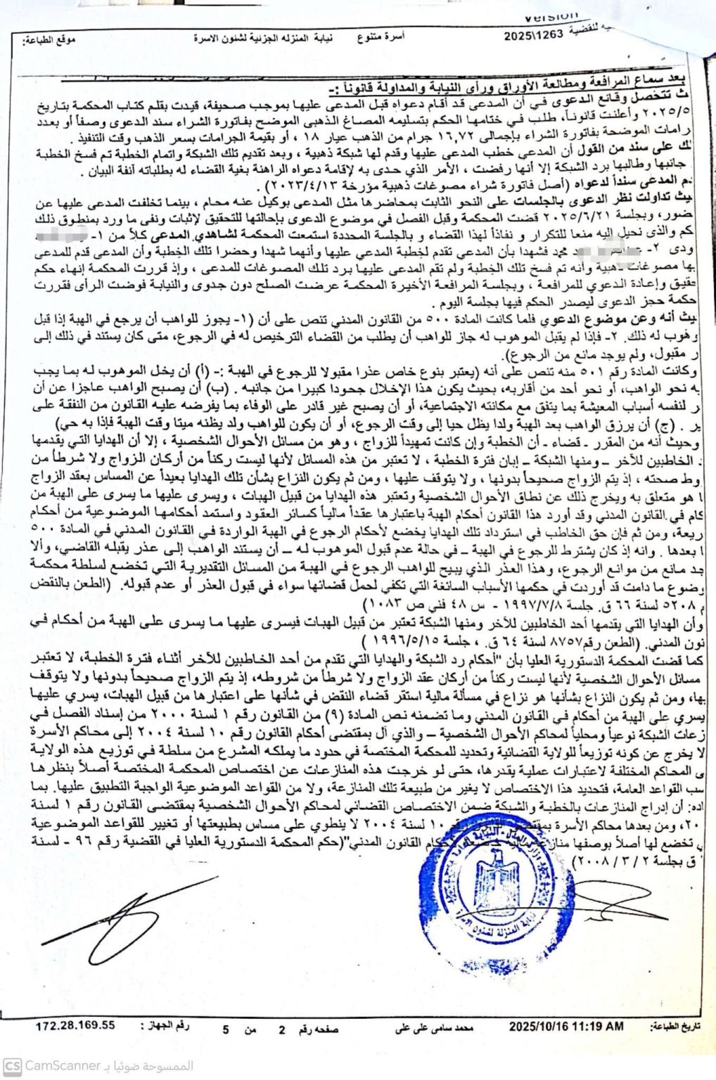 وقالت محكمة المنزلة الكلية لشؤون الأسرة إن المادة 500 من القانون المدني تجيز للواهب الرجوع في الهبة متى استند لعذر مقبول ولم يوجد مانع من موانع الرجوع، كما نصت المادة 501 على أن من الأعذار المقبولة إخلال الموهوب له بما يجب عليه نحو الواهب أو أحد أقاربه بما يعد جحودًا كبيرًا.