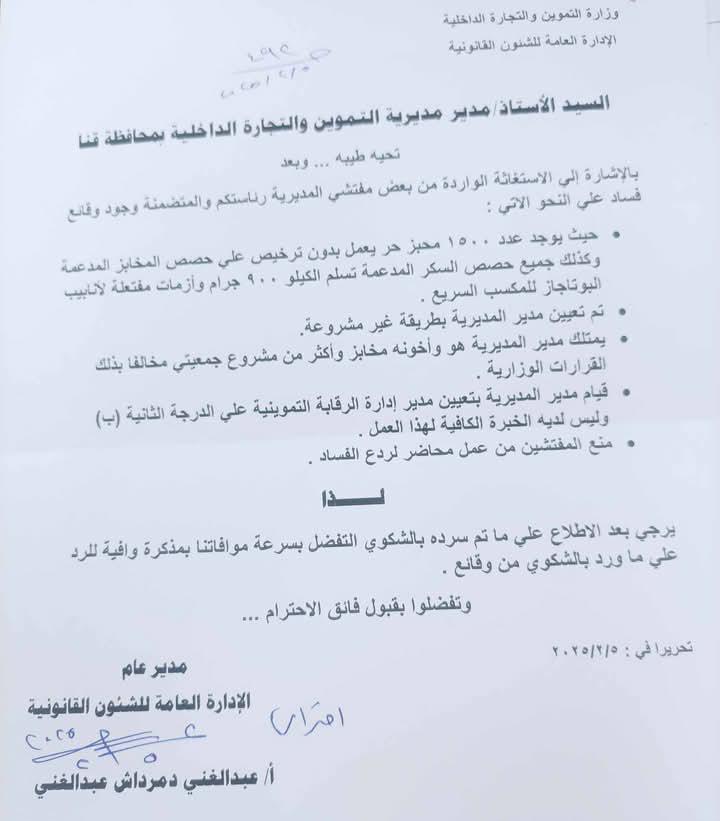 وقالت الشئون القانونية فى الخطاب الموجه لمديرية التموين بمحافظة قنا: تلقينا استغاثة عاجلة من بعض مفتشي مديرية التموين في قنا، تضمنت اتهامات خطيرة بوجود فساد ممنهج وتلاعب في السلع المدعمة المخصصة للمواطنين.