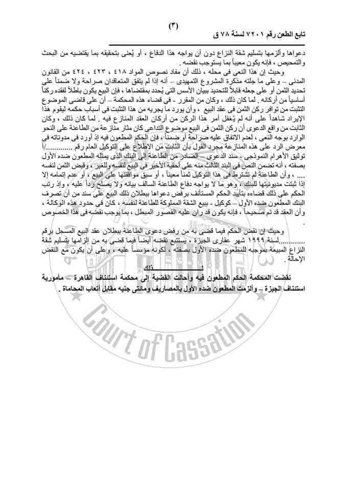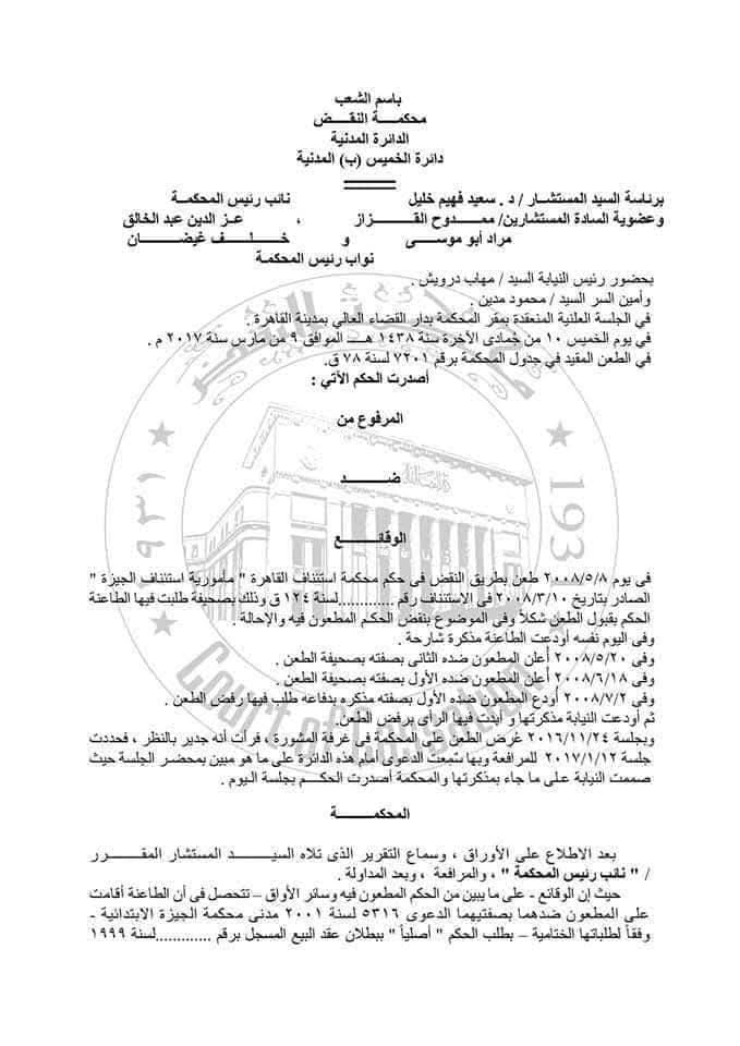 ولذلك، حكمت محكمة النقض بنقض الحكم المطعون فيه، وأحالت القضية إلى مأمورية استئناف الجيزة بمحكمة استئناف القاهرة.