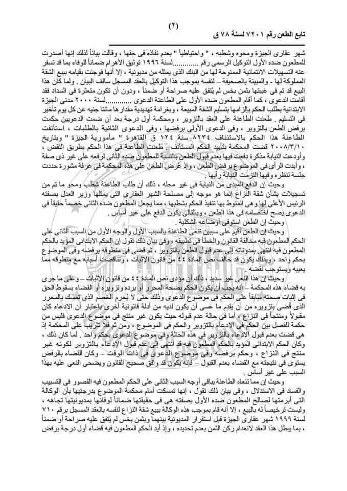 وكانت تفاصيل الدعوى محل الطعن تتلخص في طلب الطاعنة الحكم ببطلان عقد البيع المسجل بتاريخ 1999 شهر عقاري الجيزة ومحوه وشطبه، واحتياطيا عدم نفاذه في حقها، مستندة إلى أنها أصدرت للمطعون ضده الأول "البنك" توكيل رسمي عام 1996 توثيق الأهرام ضماناً للوفاء بما قد شفر عنه التسهيلات الائتمانية الممنوحة لها من البنك الذي يمثله من مديونية.