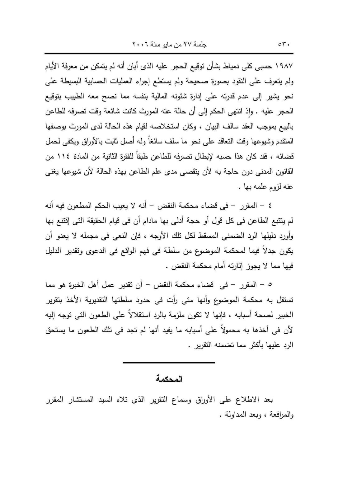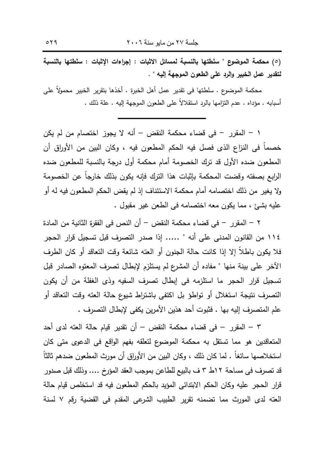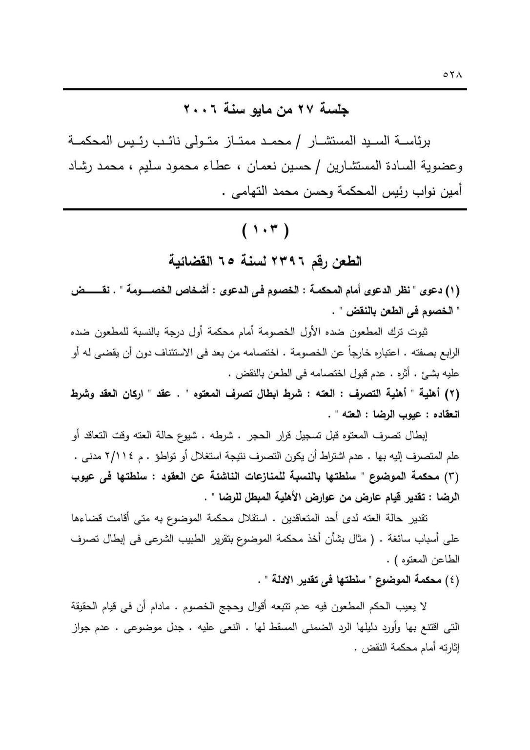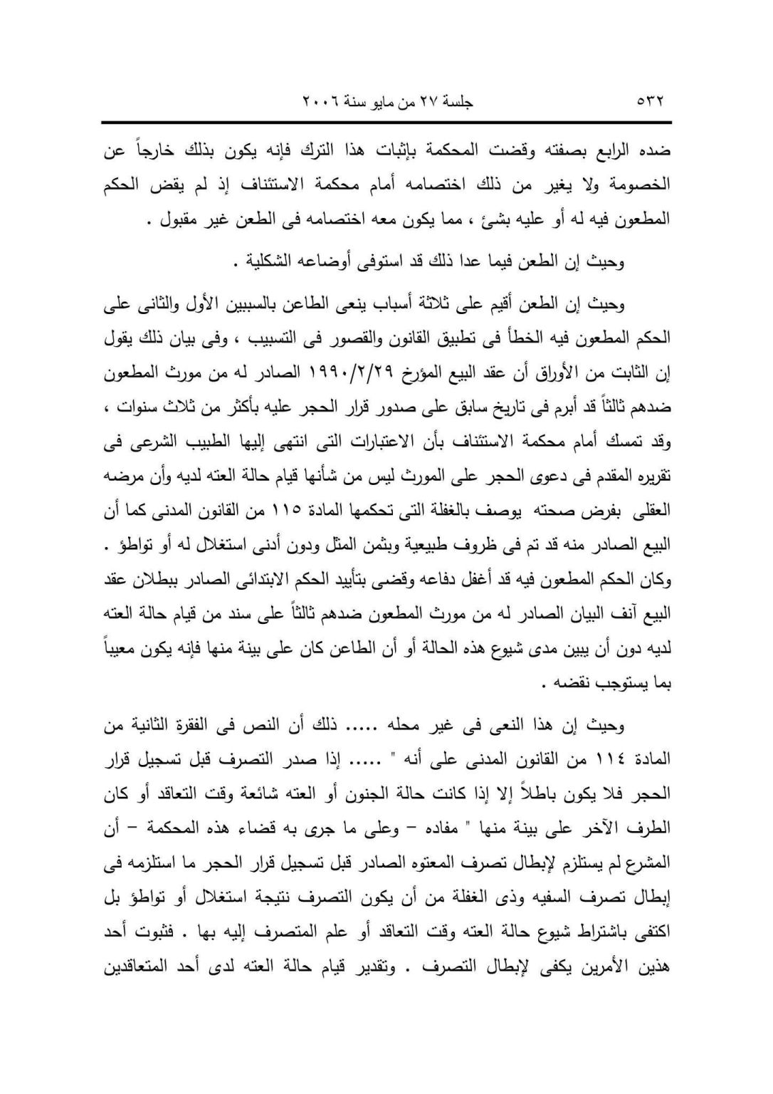 وأكدت محكمة النقض في حيثيات حكمها، أن شيوع حالة العته وقت التعاقد يكفي لإبطال التصرف دون الحاجة لثبوت الاستغلال أو التواطؤ، كما سلطت المحكمة الضوء على استقلال محكمة الموضوع في تقدير العته وصحة تقرير الخبير.، وأن عدم رد المحكمة على كل حجة من حجج الطاعن لا يعيب الحكم مادام الرد الضمني قائم.