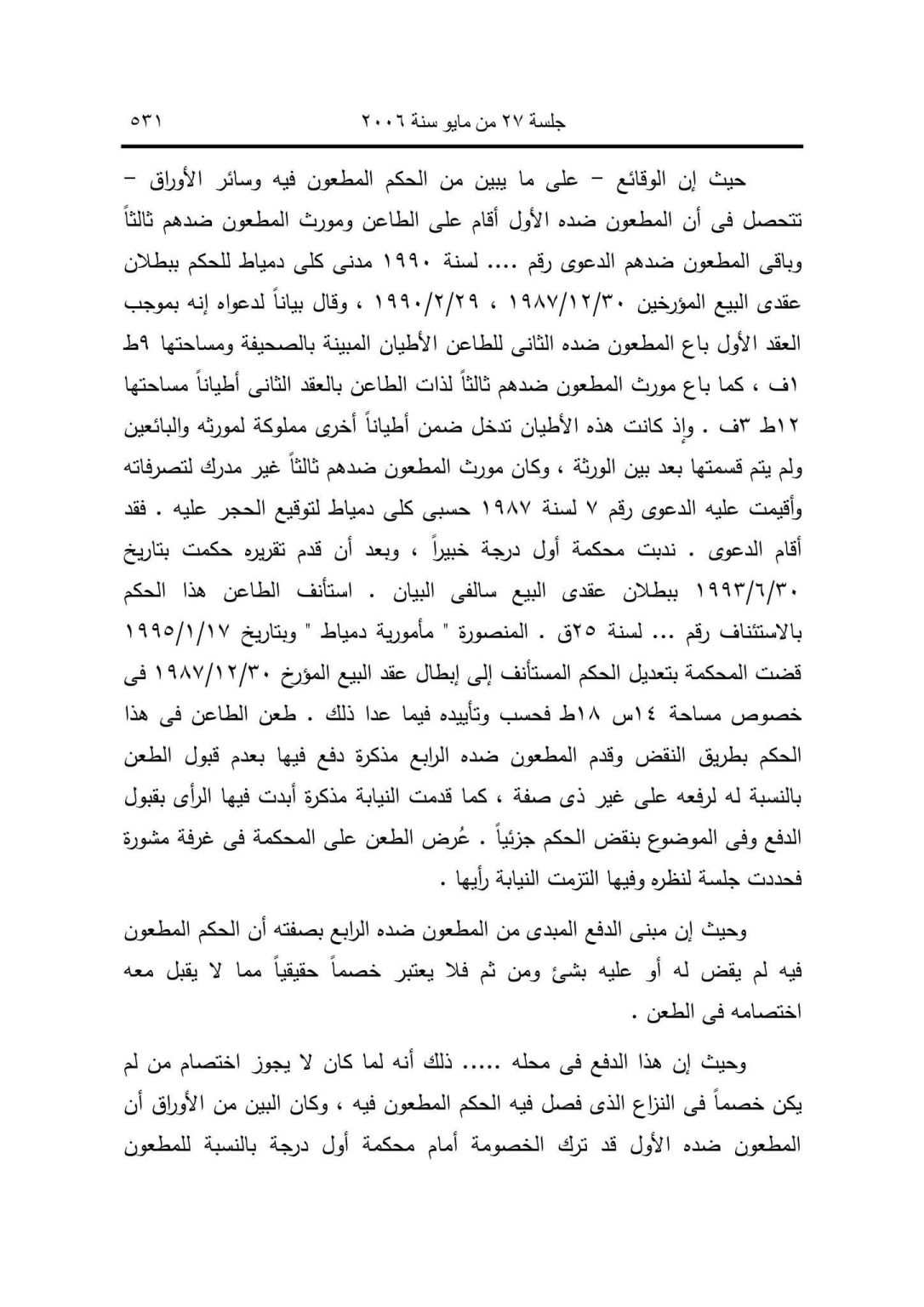 ولذلك حكمت محكمة النقض في الطعن بقبول الدفع بعدم قبول الطعن بالنسبة للمطعون ضده الرابع كونه لم يكن خصماً حقيقيا، ورفض الطعن في باقي أسباب النقض، وتأييد الحكم المستأنف فيما قضى ببطلان عقد البيع بالنسبة لمساحة 14 س 18 ط من الأطيان محل العقد.