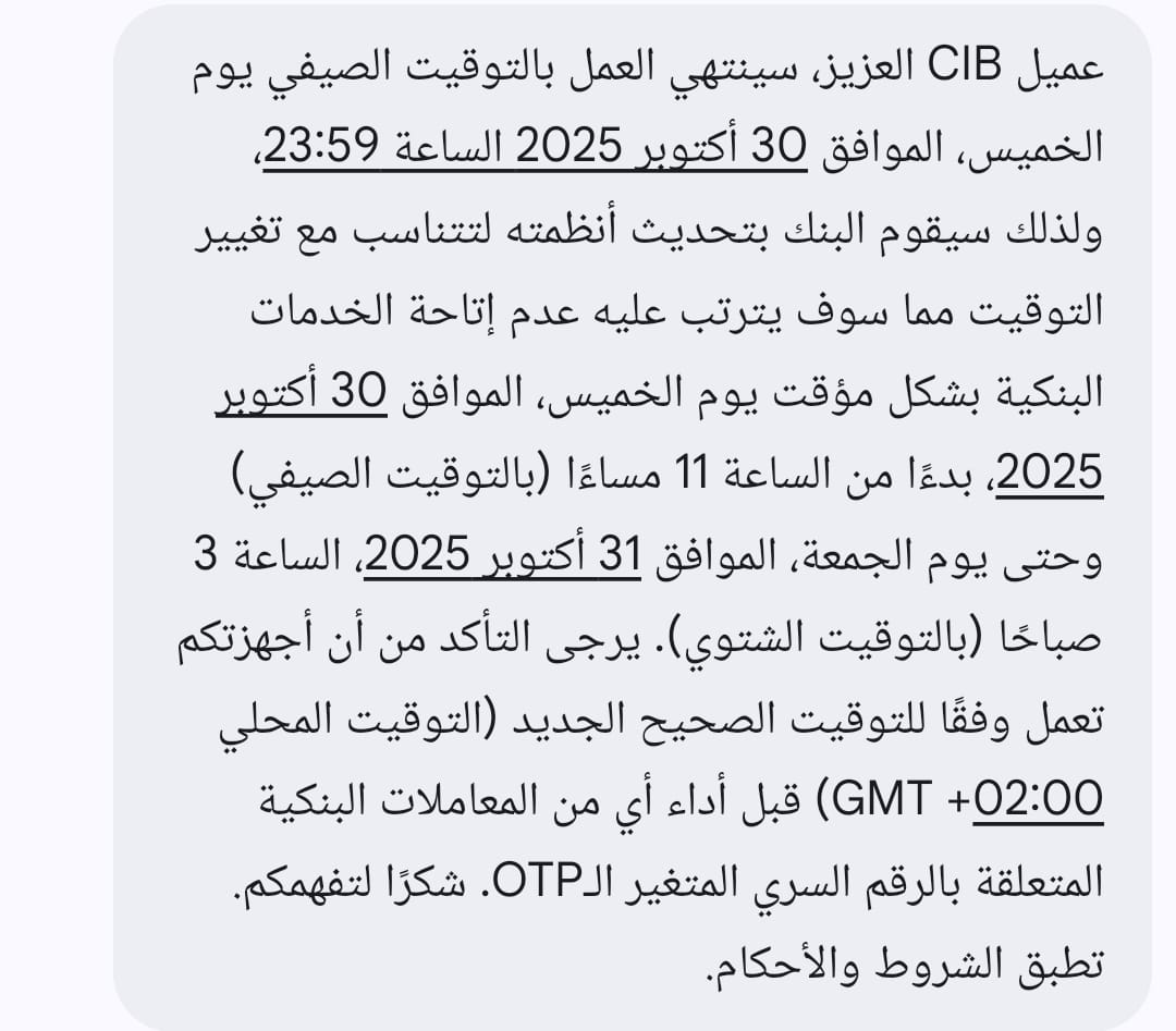 وقالت البنوك في رسائلها التي أرسلتها للعملاء إن هناك أهمية لتحديث إعدادات الوقت في الهواتف المحمولة والأجهزة الإلكترونية لتتوافق مع التوقيت الشتوي الجديد وهو GMT +02:00، وتجنب أي مشكلات في تنفيذ المعاملات أو استقبال الرقم السري المتغير (OTP) خلال فترة التحول بين التوقيت،.ولفتت إلى أن الهدف من التحديث هو ضمان دقة تزامن الأنظمة المصرفية مع التوقيت الرسمي لمصر، والحفاظ على أمن وسلامة العمليات المالية والمدخرات، كما أن فترة التوقف ستكون مؤقتة ومحدودة لعدة ساعات فقط.