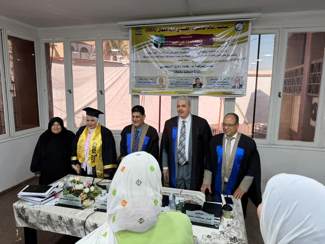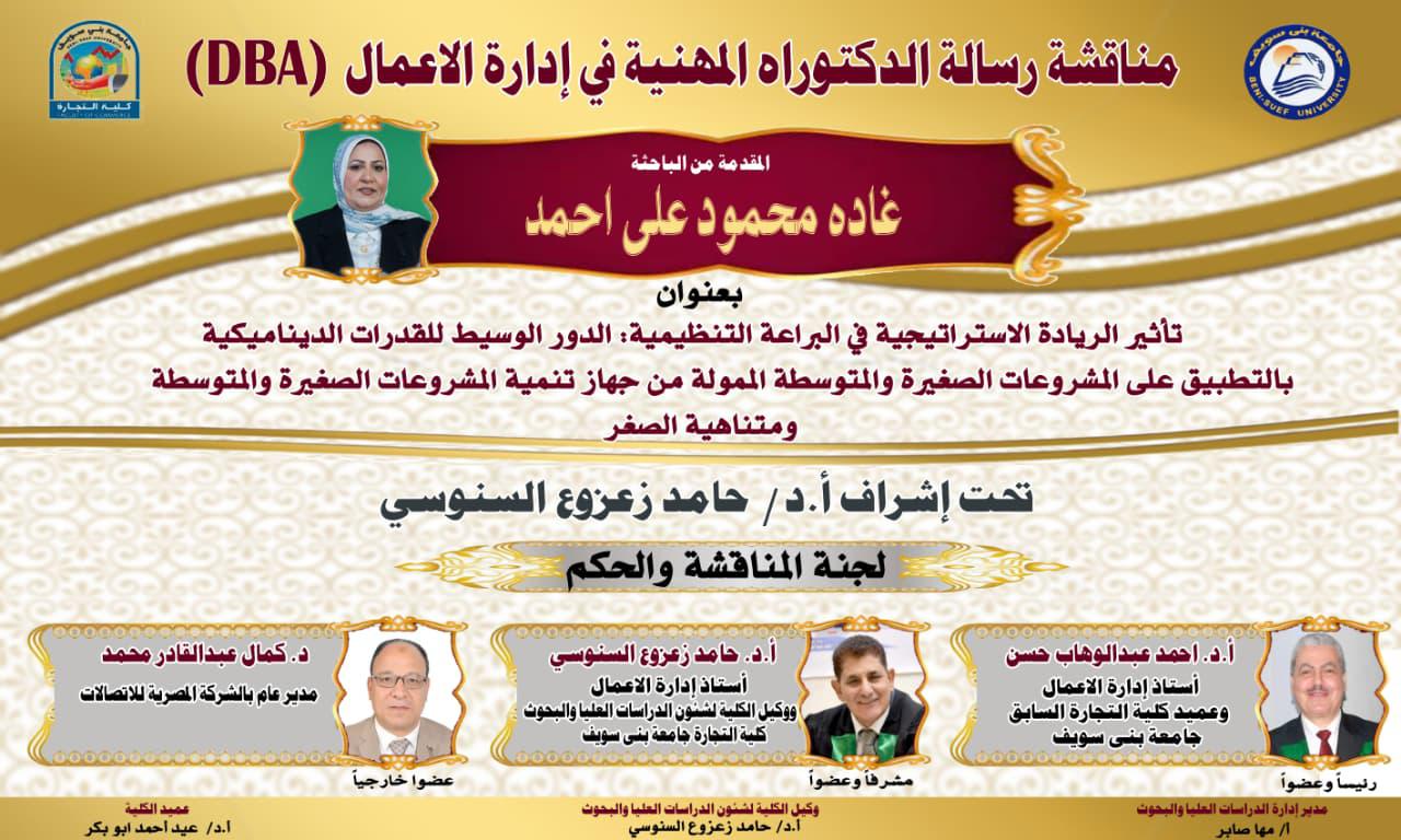 وتضم لجنة المناقشة؛ الأستاذ الدكتور أحمد عبدالوهاب حسن أستاذ إدارة الأعمال وعميد كلية التجارة السابق جامعة بني سويف رئيسا وعضوا، والأستاذ الدكتور حامد زعزوع السنوسى أستاذ إدارة الأعمال ووكيل الكلية لشئون الدراسات العليا والبحوث كلية التجارة جامعة بنى سويف، عضواً ومشرفا، والدكتور كمال عبدالقادر محمد مدير عام بالشركة المصرية للإتصالات عضوا من الخارج.