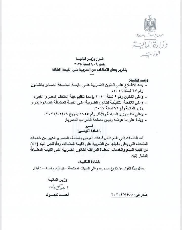 وحسب القرار رقم 101 لسنة 2025، فقد نص على أن تعد الخدمات التي تقدم داخل قاعات عرض المتحف المصري الكبير من خدمات المتاحف التي يعفى مقابلها من الضريبة على القيمة المضافة، وفقًا لنص البند 46 من قائمة السلع والخدمات المُعفاة المرافقة لقانون الضريبة على القيمة المضافة المشار إليه، وذلك في المادة الأولى للقرار.