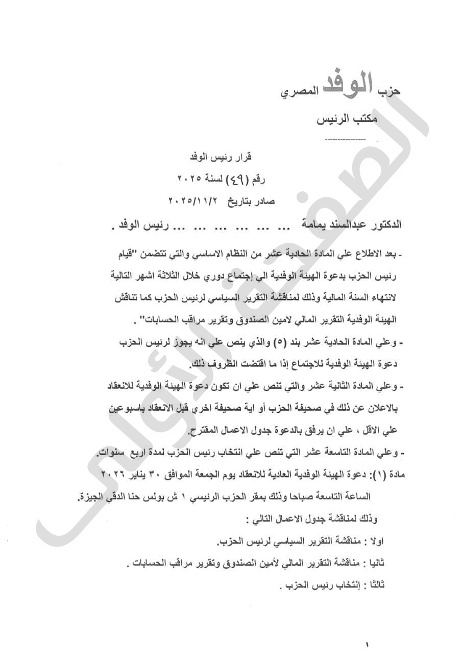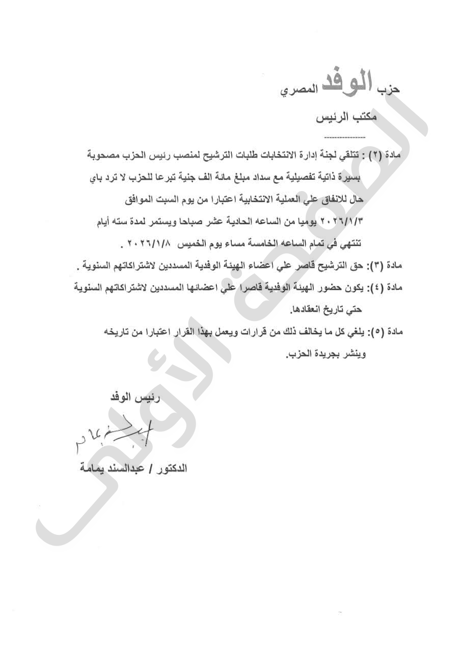وكان يمامة قد أعلن عن دعوة الجمعية العمومية لعقد اجتماع انتخابي لاختيار رئيس الحزب يوم 30 يناير المقبل، وذلك تمهيدًا لتشكيل اللجنة المشرفة على العملية الانتخابية.
