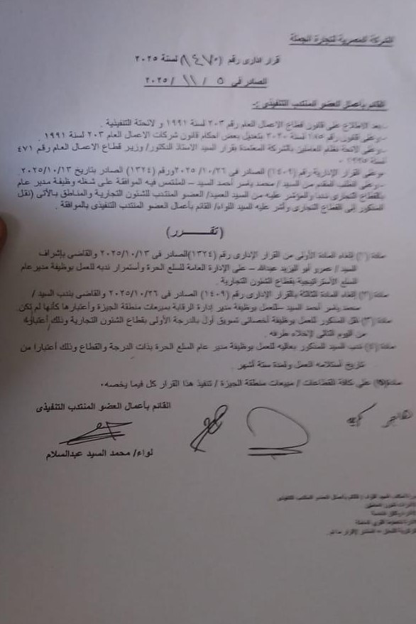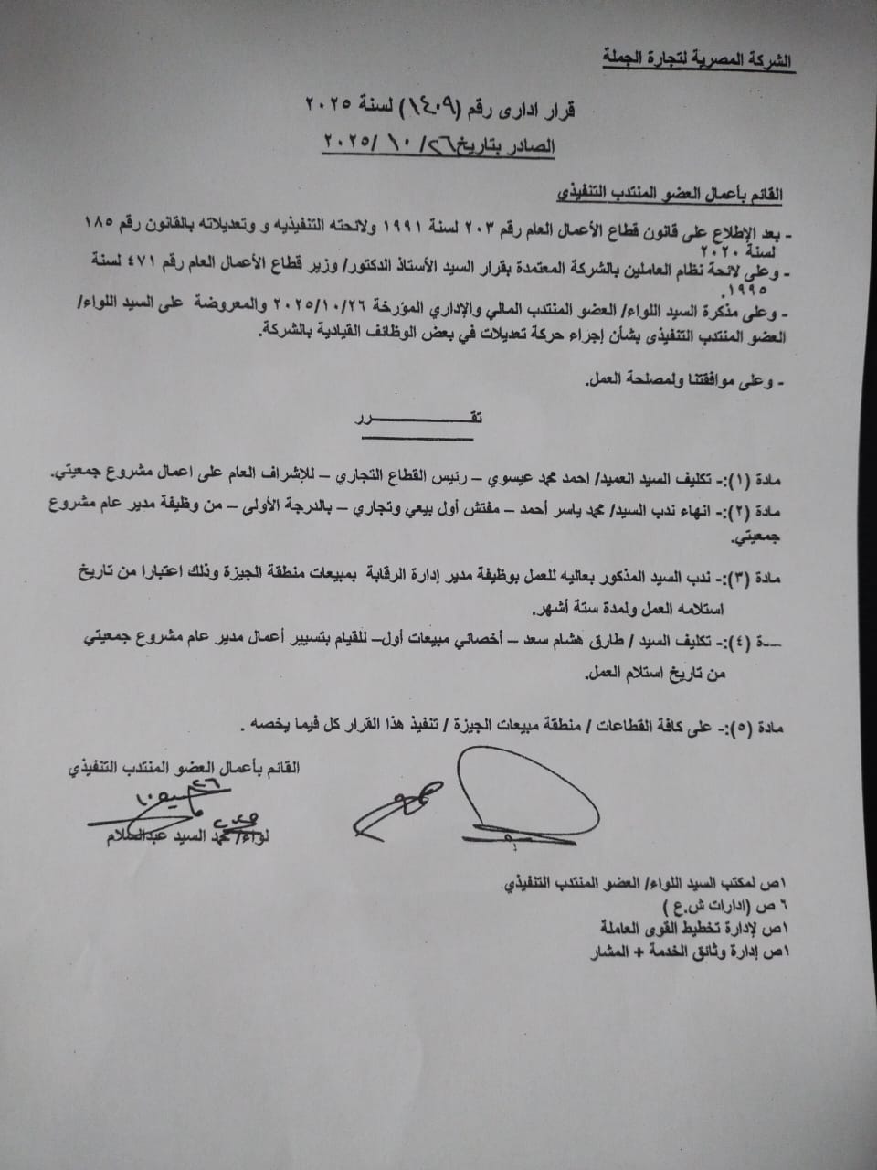 قرار العضو المنتدب بالشركة المصرية للتجارة الجملة، جاء تحت رقم 1470 لسنة 2025، والصادر بتاريخ 5 /11/ 2025، بإلغاء القرار الإداري رقم 1409 لسنة 2025 الصادر فى 26 / 10 / 2025، بتكليف العميد احمد محمد عيسوي - رئيس القطاع التجاري - للإشراف العام على اعمال مشروع جمعيتي. وانهاء ندب محمد ياسر أحمد - مفتش أول بيعي وتجاري - بالدرجة الأولى - من وظيفة مدير عام مشروع جمعيتي