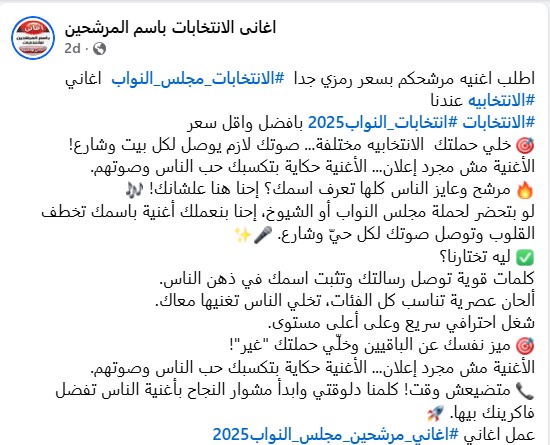 أما اليوم يستخدم مرشحي انتخابات النواب كل السبل المتاحة للترويج لأنفسهم ، والدفع بالناخبين وتحفيزهم للتصويت لصالحهم، وفي الفترة الأخيرة ظهر على الساحة "بزنس جديد" وهو صناعة أغاني المرشحين وأغنية لكل مرشح في انتخابات النواب 2025 .