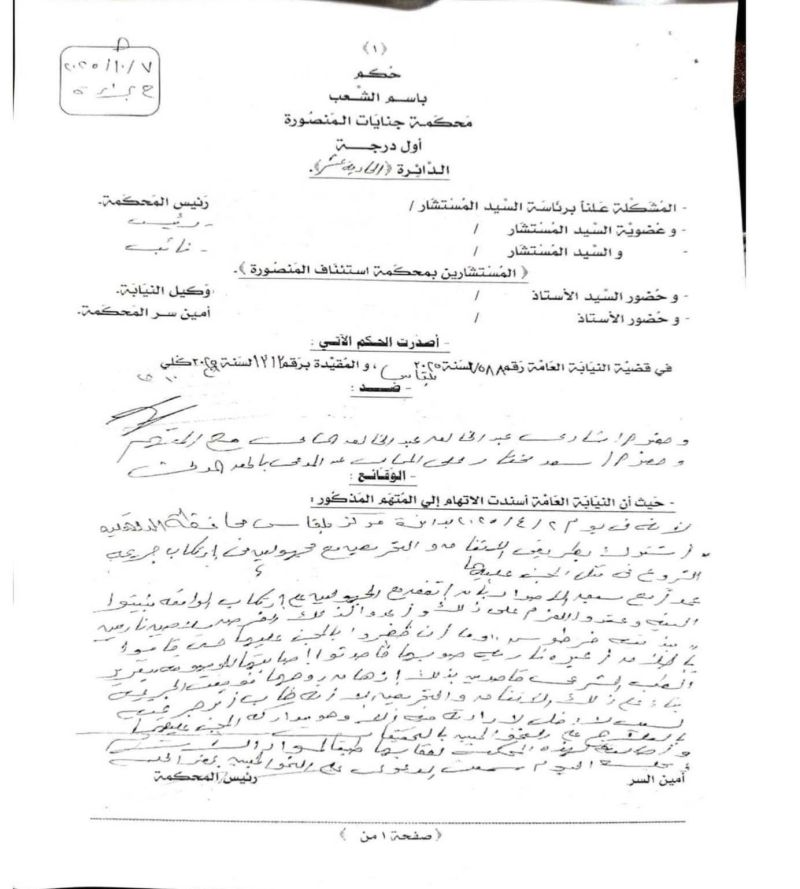 ولذلك، قضت محكمة جنايات المنصورة ببراءة المتهم مما أسند إليه، وبرفض الدعوى المدنية المقامة من المدعي بالحقوق المدنية، وبمصادرة المضبوطات إن وجدت.