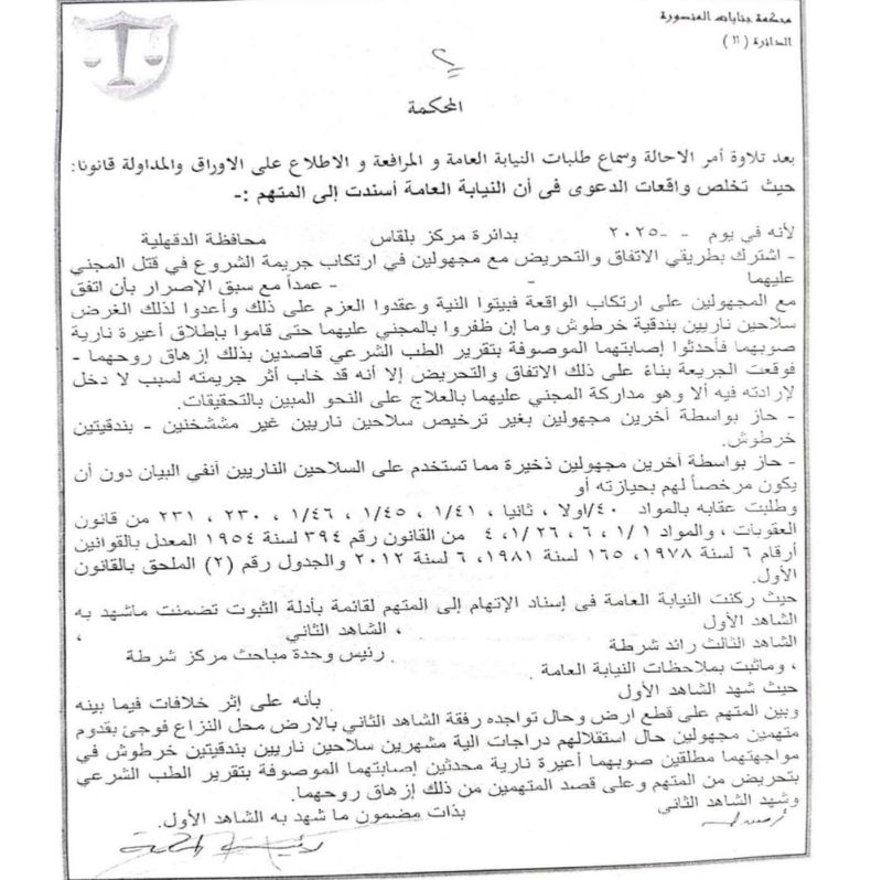 ولكن محكمة جنايات المنصورة رأت بعد تمحيص الأدلة، أن الاتهام لم ينهض على دليل يقيني، حيث جاءت أقوال الشهود مرسلة لا يعضدها دليل مادي، كما لم يتم ضبط أي من الجناة المجهولين، فضلاً عن تقديم المتهم ما يفيد وجوده بالمستشفى وقت الواقعة، ما يقطع باستحالة ارتكابه الجريمة.