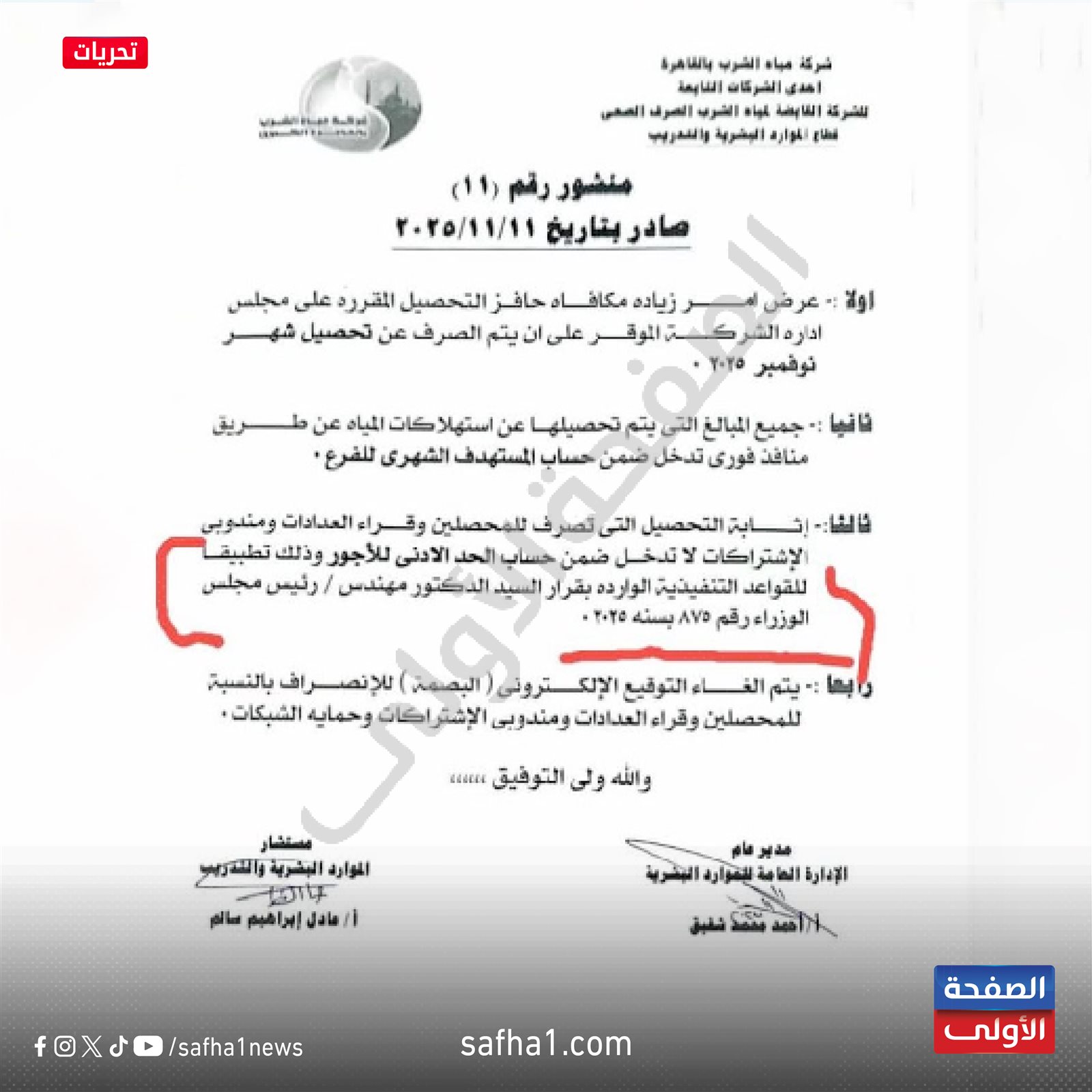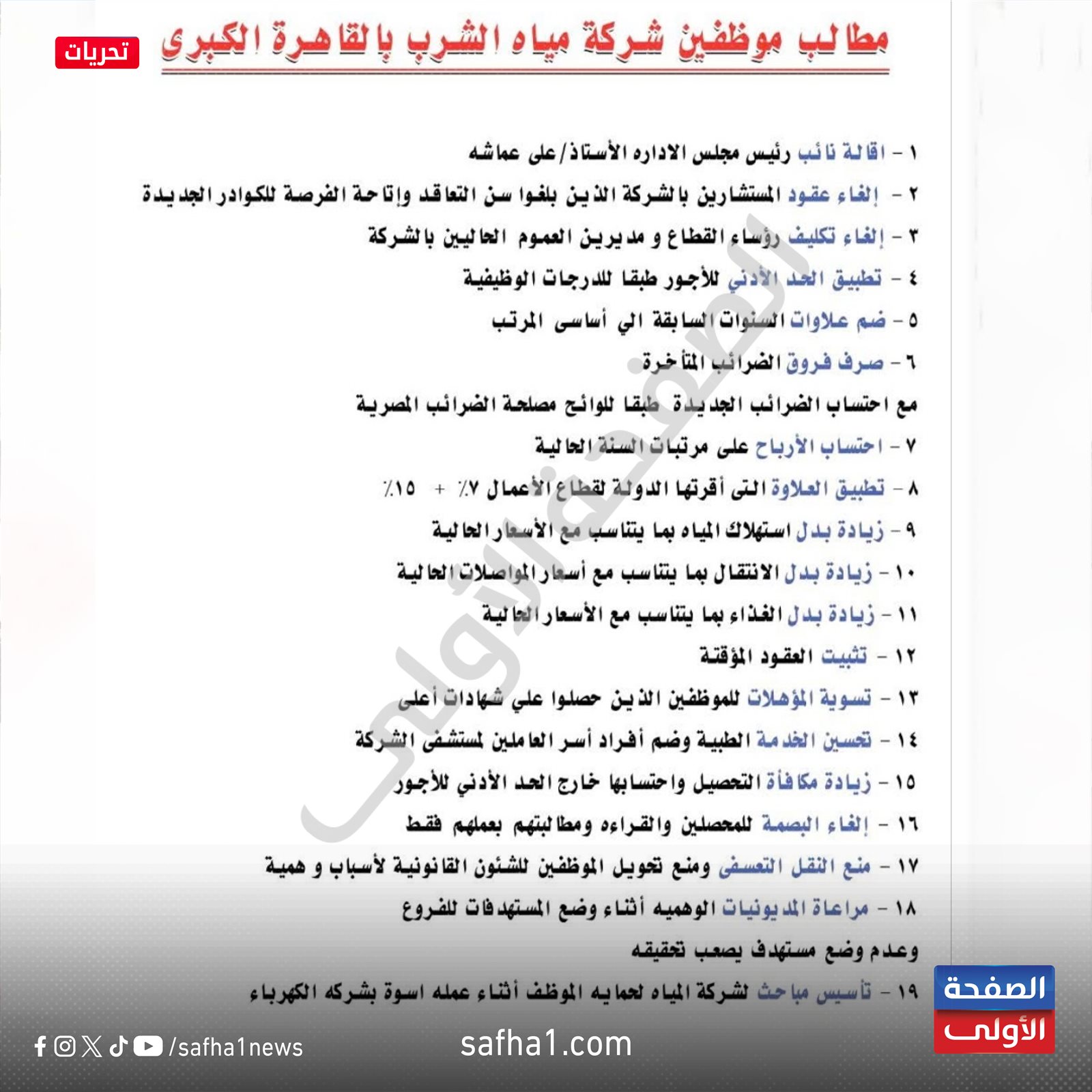 وتضمنت المطالب كذلك، إقالة مجلس الإدارة الحالي لشركة مياه الشرب بالقاهرة الكبرى، وإلغاء عقود المستشارين الذين بلغوا سن التقاعد وإتاحة الفرصة للكوادر الجديدة، وتحديد الحد الأدنى للأجور للدرجات الوظيفية، وتسوية المؤهلات، وتحسين الخدمة الطبية، وزيادة مكافأة التحصيل ومنع النقل التعسفي ومراعاة المديونيات الوهمية.