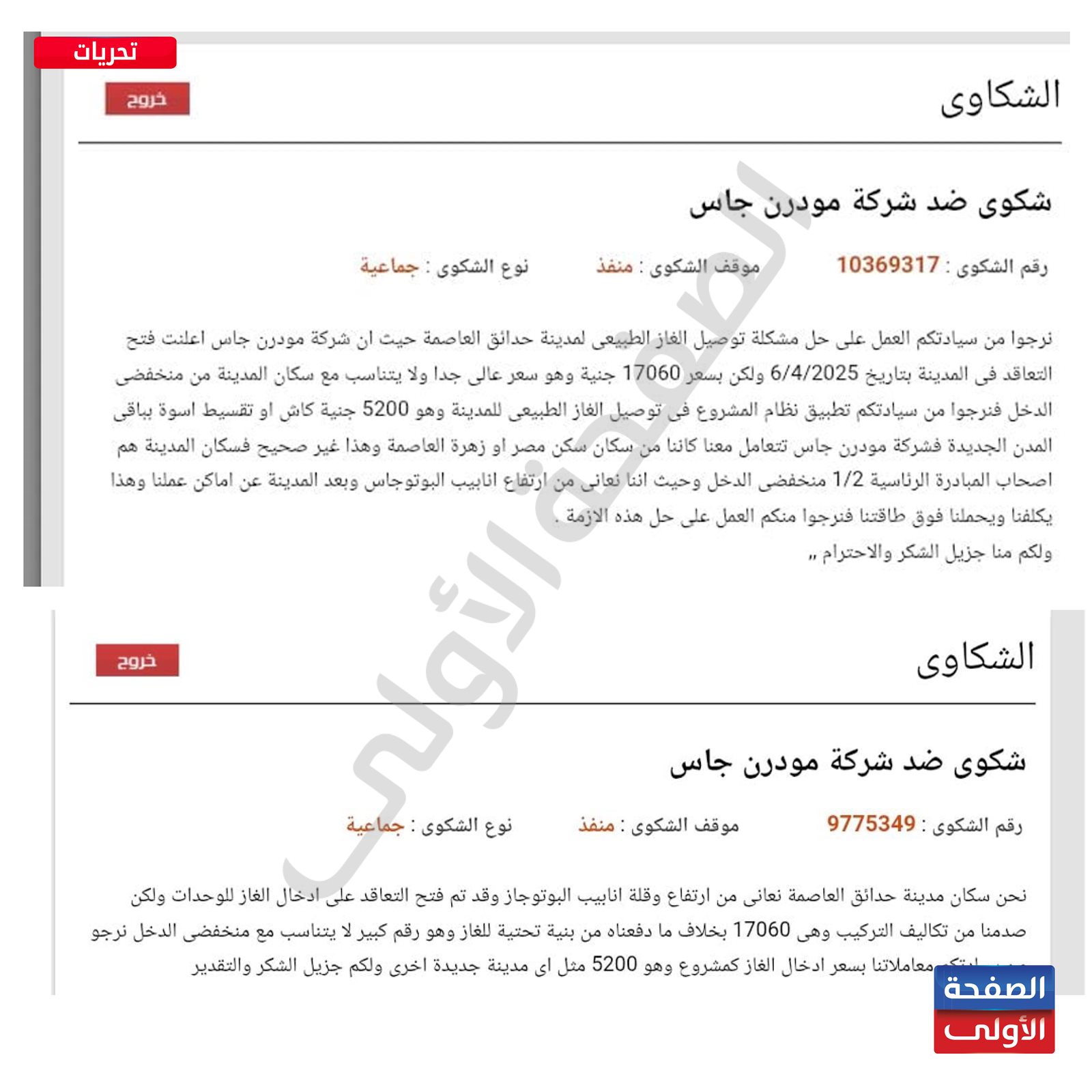 وتوالت الشكاوى التي أرسلها سكان حدائق العاصمة إلى جميع الجهات الحكومية المسؤولة، ومنها الشكاوى الجماعية رقم 10369317، ورقم 9775349 ضد شركة مودرن جاس، والتي تم تقديمها إلى مجلس الوزراء.