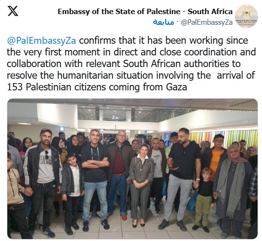 السفارة الفلسطينية في جنوب أفريقيا أصدرت بيانا أوضحت فيه أن الفلسطينيين وصلوا دون أي إشعار أو تنسيق مسبق، وأن منظمة مضللة وغير مسجلة استغلت الظروف الإنسانية المأساوية لأهالي قطاع غزة، وجمعت الأموال منهم، وسهلت سفرهم بطريقة غير مسؤولة، ثم حاولت التنصل من أي مسؤولية عند ظهور التعقيدات.