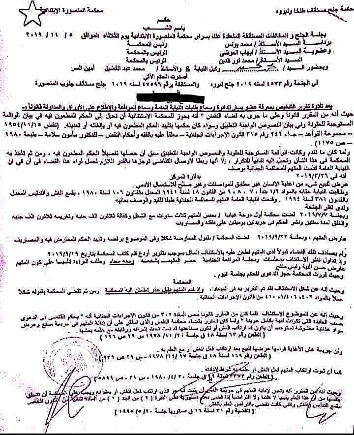 وجاء في حكم الجنحة رقم 4573 لسنة 2019 جنح نبروه، والمستأنفة برقم 47596 لسنة 2019 جنح مستأنف جنوب المنصورة، بتاريخ 5 نوفمبر 2019، أن النيابة العامة قدمت المتهم للمحاكمة الجنائية لأنه في 2019/3/26 عرض للبيع شيء من أغذية الانسان غير مطابق للمواصفات وغير صالح للاستعمال الأدمي.