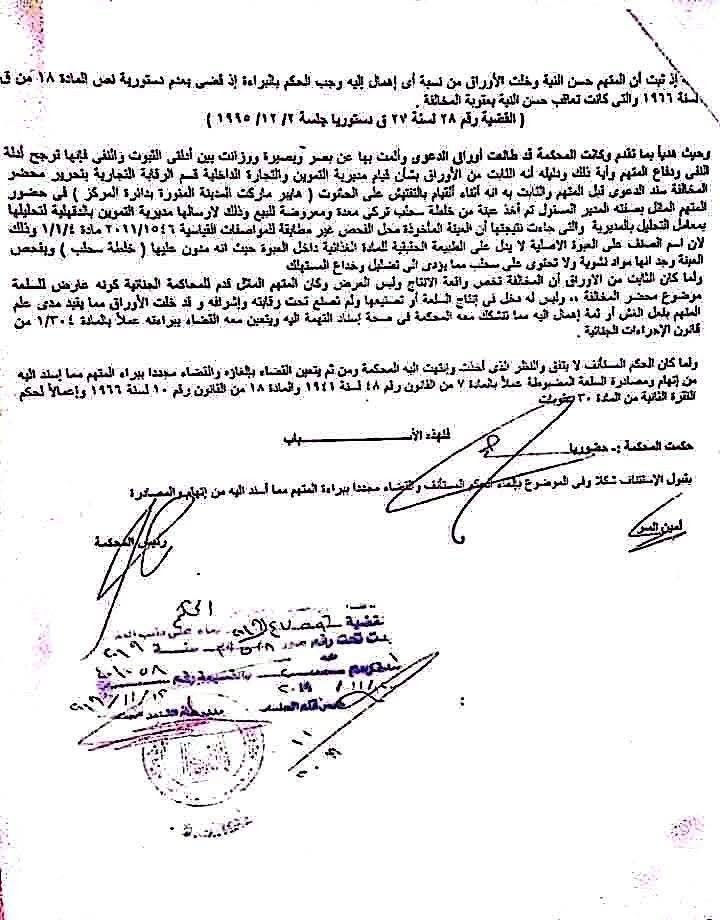 وقالت المحكمة في حيثيات حكمها، أنه من المقرر بقضاء محكمة النقض أن إدانة التاجر المتهم في جريمة صنع وعرض مواد غذائية مغشوشة تستوجب أن يكون قد ارتكب العش أو تكون صناعتها قد تمت تحت إشرافه ورقابته مع علمه بغشها، وأن جريمة غش الأغذية تعني عرضها للبيع بعد ارتكاب فعل الغش، أو مع العلم به، كما أن ثبوت ارتكاب المتهم فعل العش أو علمه به شرط لإدانته.