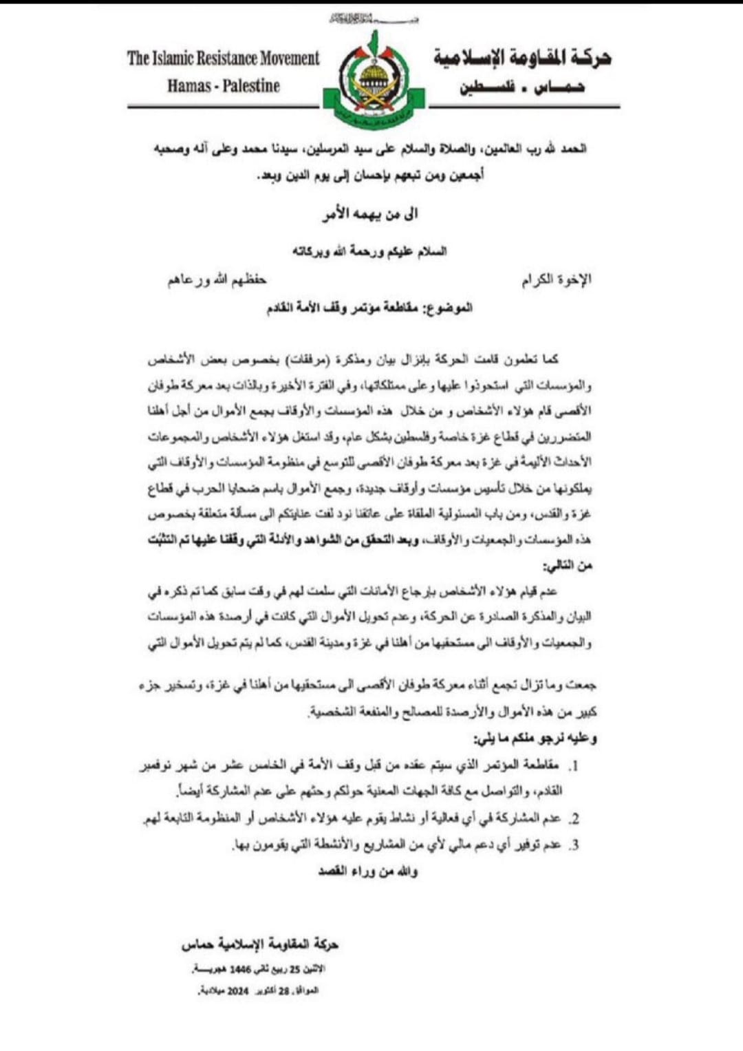 وأكدت حماس أن هذه المؤسسات باتت تعمل بعيداً عن التوجيهات، بعد أن استولى عليها خارجون عن الصف الذين يستخدمون تزكيات قديمة لجمع التبرعات بشكل يضر بأهل غزة والقدس.
