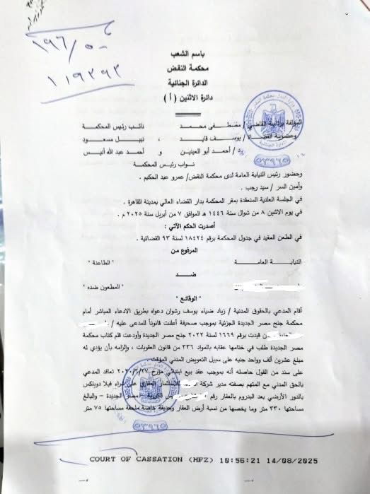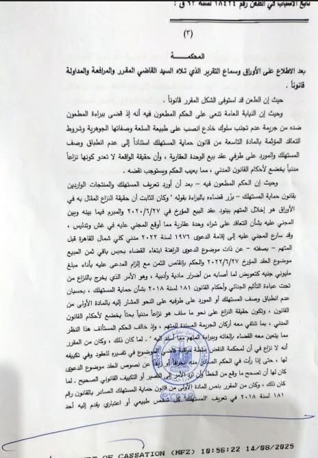 أرست محكمة النقض، مبدأ قانونيا وقضائيا مهما، وهو أنه إذا ارتكب مورد العقار سلوكًا خادعًا يتعلق بخصائص الوحدة العقارية، أو شروط التعاقد، أو الترخيص المتعلق بها، فيجوز تطبيق أحكام قانون حماية المستهلك ومساءلته جنائيًا عن ذلك إلى جانب المسؤولية المدنية، ولا يخرج النزاع تلقائيًا عن دائرة التجريم لمجرد ورود عناصره في نزاع مدني.