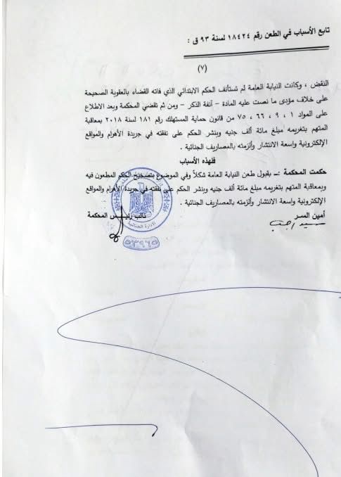 ولذلك، حكمت محكمة النقض بقبول طعن النيابة العامة شكلاً، وفي الموضوع بنقض الحكم المُطعن فيه، ومعاقبة المطعون ضده غرامة مالية مقدارها مائة ألف جنيه، مع نشر الحكم على نفقة المطعون ضده في جريدة «الأهرام» والمواقع الإلكترونية واسعة الانتشار، وإلزامه بالمصاريف الجنائية.