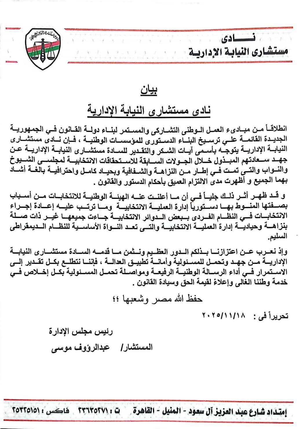 وأكد نادي مستشاري هيئة النيابة الإدارية، أن ما أعلنته الهيئة الوطنية للانتخابات من أسباب حول إعادة إجراء الانتخابات بالنظام الفردي في بعض الدوائر، جاءت غير ذات صلة بنزاهة وحيادية إدارة العملية الانتخابية، والتي تعد النواة الأساسية للنظام الديمقراطي السليم.