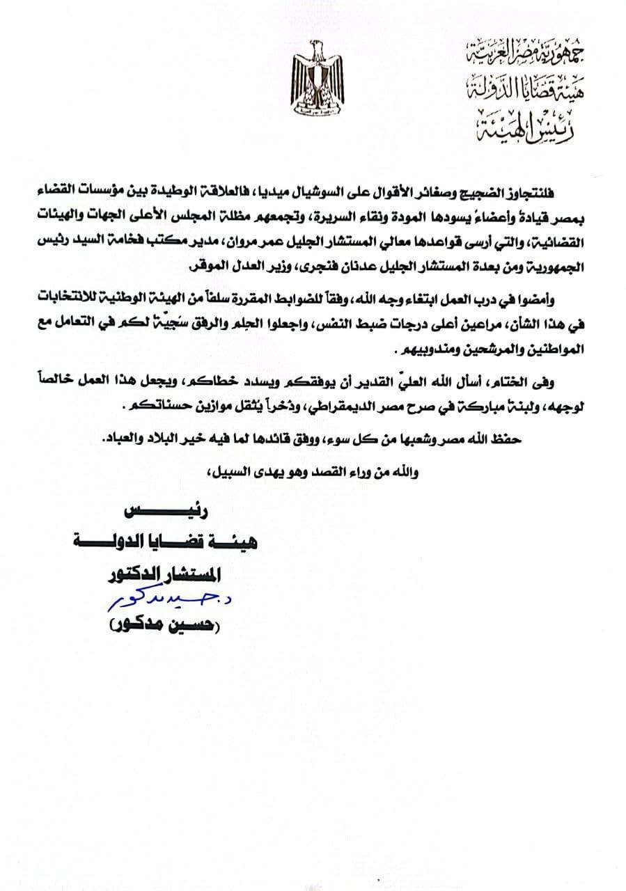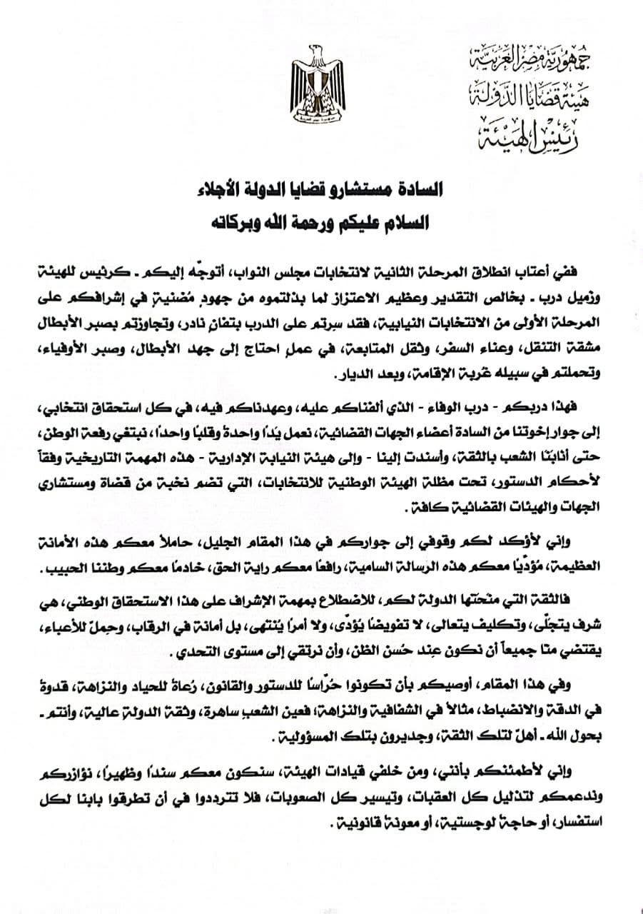 وقال رئيس هيئة قضايا الدولة، في بيان: "مع انطلاق المرحلة الثانية من انتخابات مجلس النواب، يسعدني – بصفتي رئيسًا للهيئة وزميل درب – أن أعبّر لكم عن خالص التقدير وعظيم الاعتزاز بما بذلتموه من جهود مضنية خلال إشرافكم على المرحلة الأولى من الاستحقاق الانتخابي".