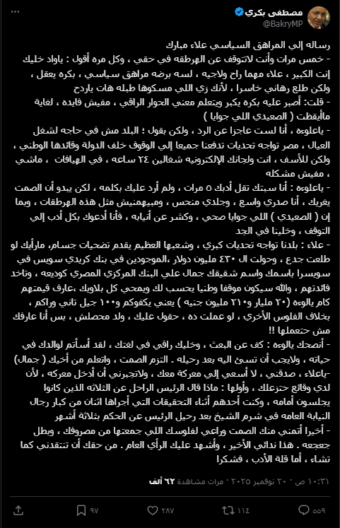 وأضاف مصطفى بكري : يا علوءه: أنا سبتك تقل أدبك 5 مرات، ولم أرد عليك بكلمه، لكن يبدو أن الصمت يغريك، أنا صدري واسع، وجلدي منحس، ومبيهمنيش مثل هذه الهرطقات ، وبما إن (الصعيدي) اللي جوايا صحي، وكشر عن أنيابه، فأنا أدعوك بكل أدب إلي التوقف، وخلينا في الجد، علاء: بلدنا تواجه تحديات كبرى، وشعبها العظيم يقدم تضحيات جسام.