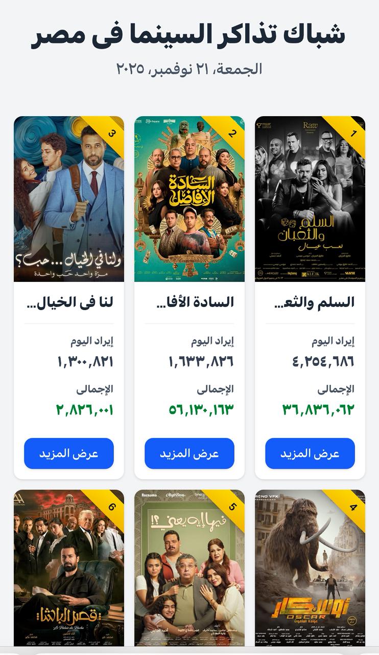 وجاءت الإيرادات أمس الجمعة كالتالي حيث حقق "السلم والثعبان2" 4 مليون و 254 الف جنيها ليصبح اجمالي ايراداته حتي الان (36 مليون و 836 الف) جنيها مصريا بينما جاءت باقي ايرادات الافلام امس الجمعة كالتالي حيث حقق "السادة الافاضل" مليون و 633 الف جنيها و "لنا في الخيال حب" مليون و 300 الف جنيها و"فيها ايه يعني" 472 الف و 204 جنيها و"قصر الباشا" 426 الف و 823 جنيها و "اوسكار" 513 الف و 597 جنيها و "هيبتا ٢" ١٦ الف و ٥٩٦ جنيها .