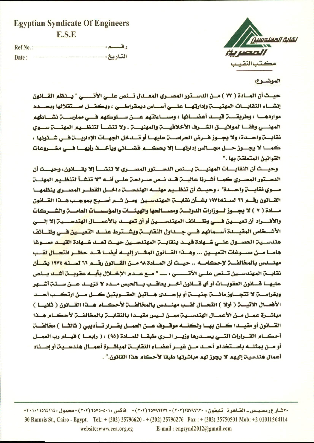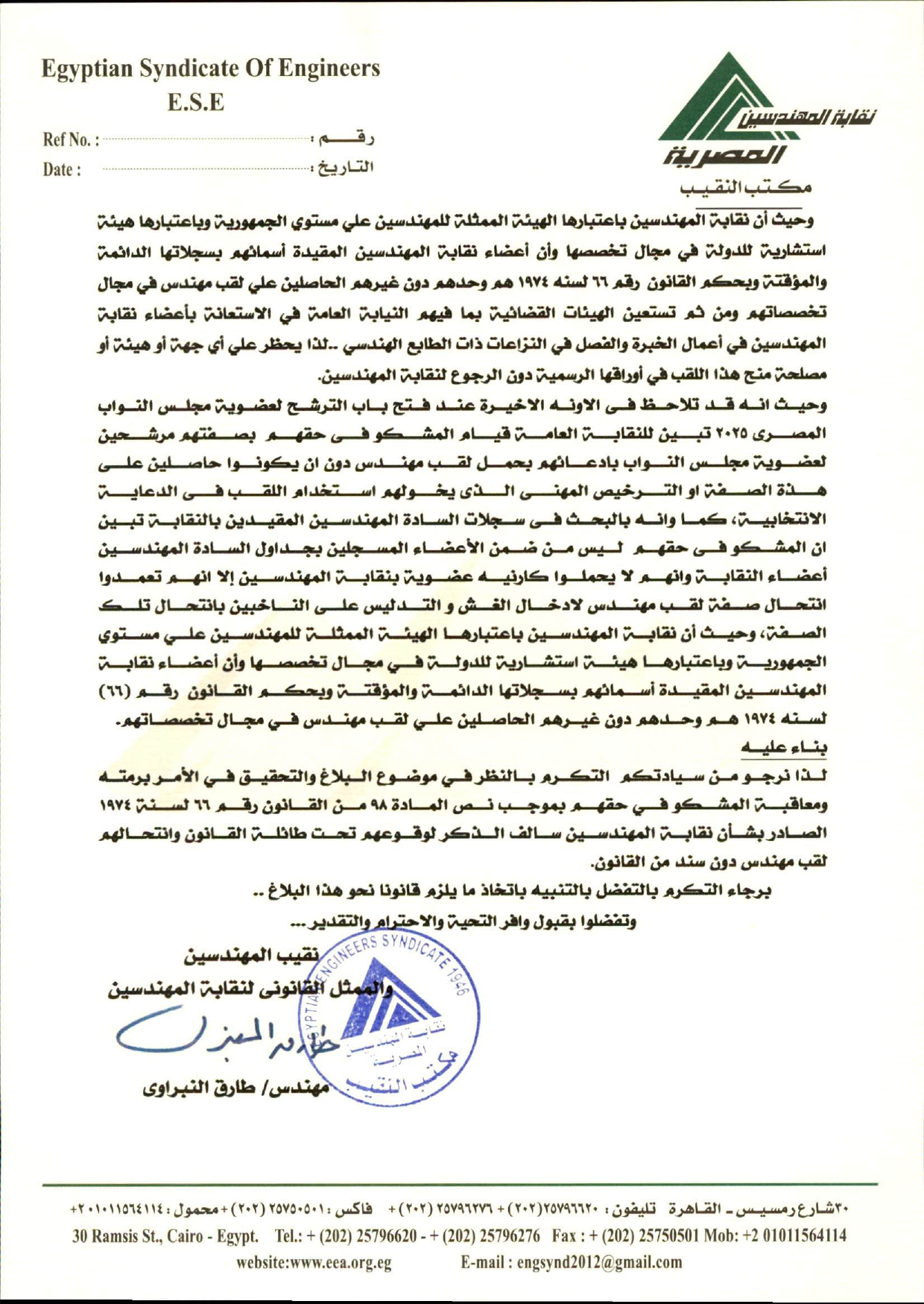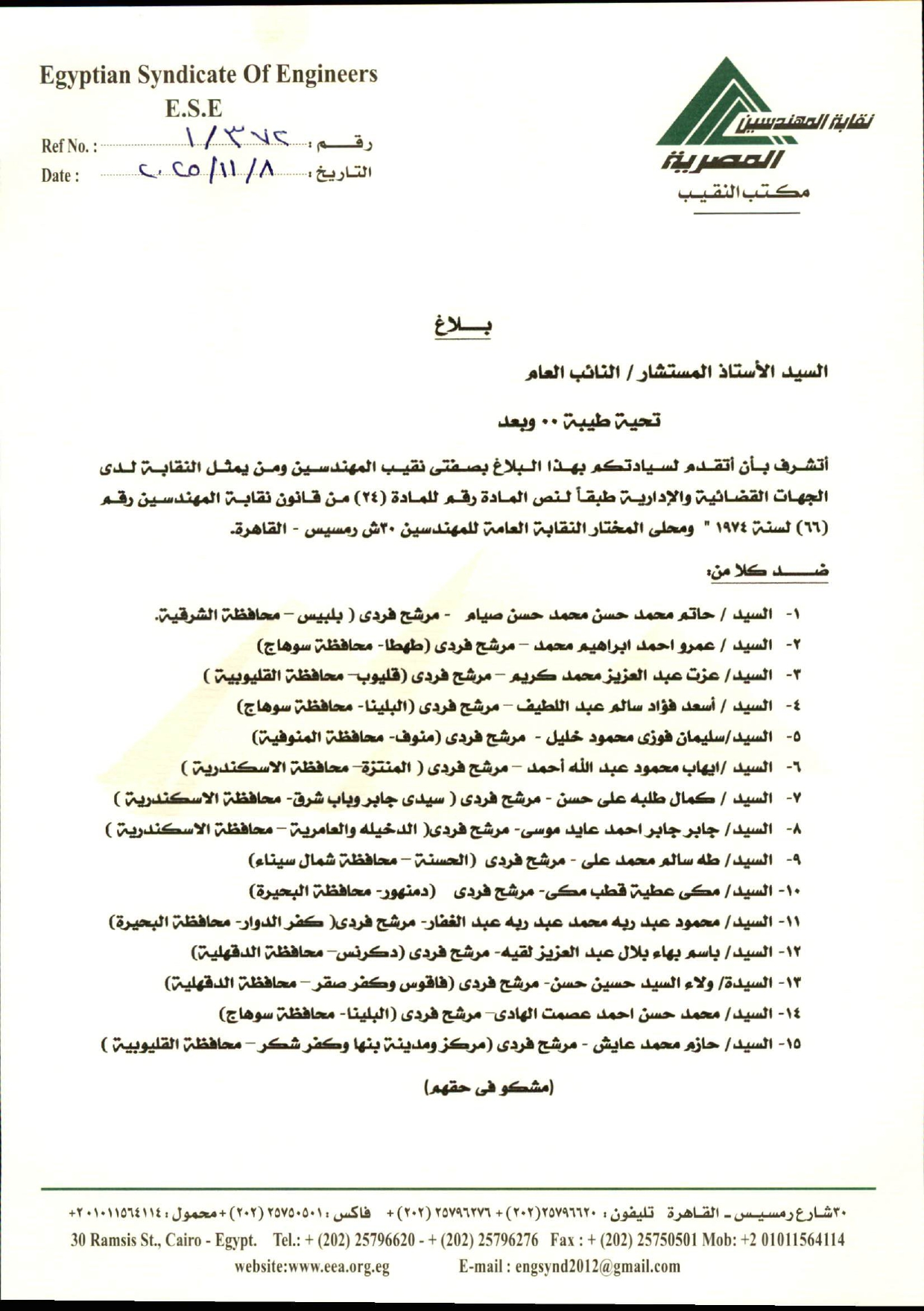 كما أنه بالبحث فى سجلات المهندسين المقيدين بالنقابة، تبين أن المشكو فى حقهم ليسوا من ضمن الأعضاء المسجلين بجداول المهندسين أعضاء النقابة، وأنهم لا يحملوا كارنيه عضوية بنقابة المهندسين، إلا انهم تعمدوا انتحال صفة لقب مهندس، لإدخال الغش والتدليس على الناخبين بانتحال تلك الصفة، وحيث أن نقابة المهندسين باعتبارها الهيئة الممثلة للمهندسين علي مستوي الجمهورية، وباعتبارها هيئة استشارية للدولة في مجال تخصصها، وأن أعضاء نقابة المهندسين المقيدة أسمائهم بسجلاتها الدائمة والمؤقتة وبحكم القانون رقم 66 لسنه 1974 هم وحدهم دون غيرهم الحاصلين علي لقب مهندس في مجال تخصصاتهم.