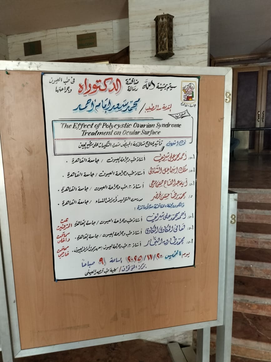 قدم الطبيب محمد سعد إمام، ماجستير طب وجراحة العيون كلية طب قصر العيني جامعة القاهرة، أخصائي المياه الزرقاء بالمعهد التذكاري للأبحاث الرمدية، رسالة دكتوراه في طب وجراحة العيون بكلية طب قصر العيني، تحت عنوان: «تأثير متلازمة المبيض متعدد التكيسات على سطح العين».
