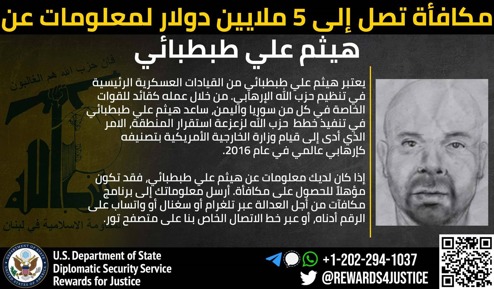 وكان برنامج «مكافآت من أجل العدالة» الأمريكي قد رصد مكافأة تصل إلى 5 ملايين دولار أمريكي مقابل معلومات عن هيثم الطبطبائي، مشيراً إلى أن الأعمال قام بها طبطبائي في سوريا واليمن ما هي إلا جزء من جهد أكبر يبذله «حزب الله» لتوفير التدريب والعتاد والجنود لدعم أنشطته الإقليمية لزعزعة الاستقرار.