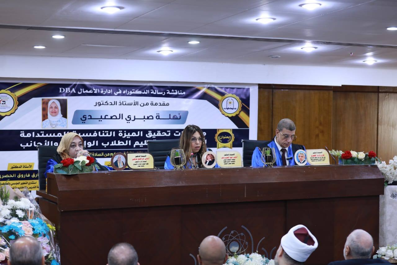 حازت الأستاذة الدكتورة نهلة الصعيدي مستشارة شيخ الأزهر لشئون الوافدين، رئيس مركز تطوير تعليم الوافدين والأجانب، على درجة الدكتوراه المهنيَّة في إدارة الأعمال (DBA ) من جامعة حلوان عن رسالتها «متطلباتُ تحقيق المَيْزة التنافسية المستدامة لمراكز تطوير تعليم الطلاب الوافدين والأجانب».