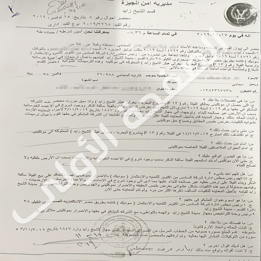 وذكر المحامى وكيل الشاكية بانه سبق وان قام بتحرير محضر أخر ضد الشركة برقم 4019 لسنة 2019 ادارى الشيخ زايد و أخطر جهاز مدينة الشيخ زايد بموجب خطاب وارد برقم 1847 بتاريخ 3 نوفمبر 2019 وذلك لاجراء معاينة واثبات التلفيات الموجودة بالفيلا الا ان الجهاز أخذ فى التسويف والمماطلة.