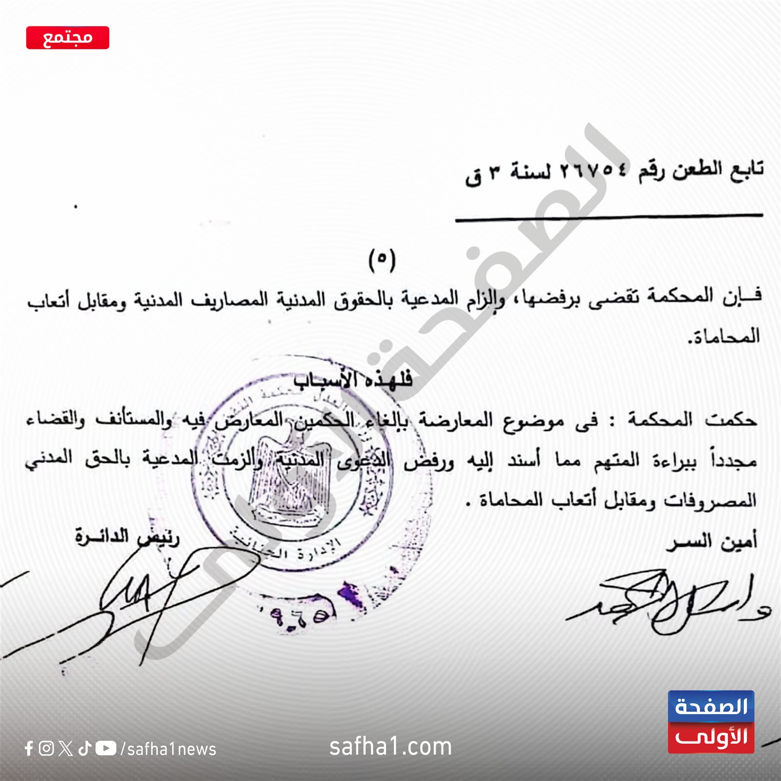 وفي النهاية، حكمت الدائرة الجنائية في محكمة النقض بإلغاء الحكمين المعارض فيه والمستأنف، والقضاء مجددًا ببراءة المتهم من تهمة التبديد، رفض الدعوى المدنية، وإلزام المدعية بالحق المدني بالمصاريف المدنية ومقابل أتعاب المحاماة.