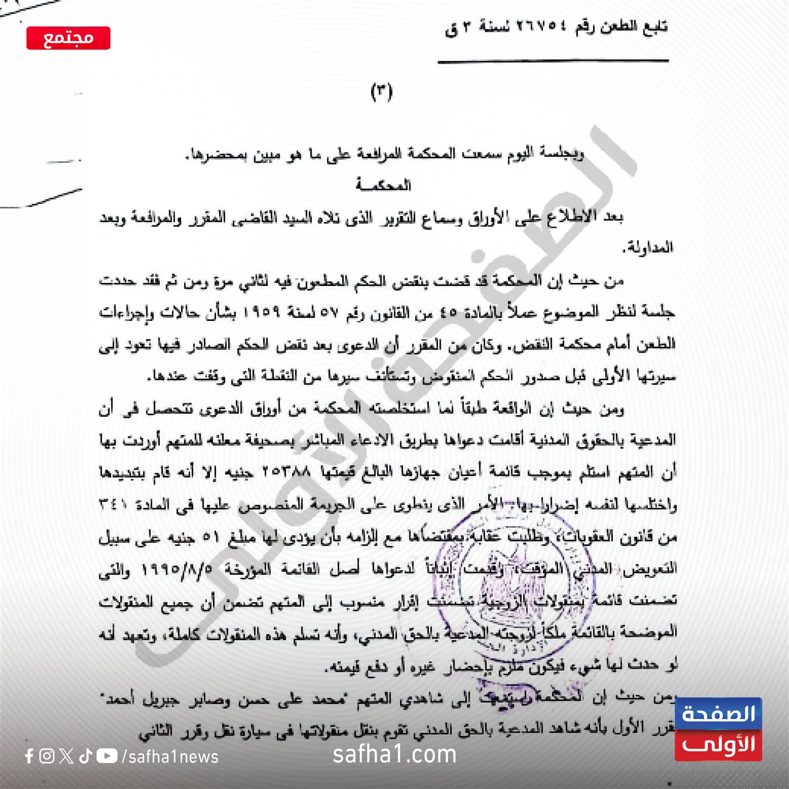 وأكدت محكمة النقض في حيثيات حكمها أن الدعوى بعد نقض الحكم تعود إلى سيرتها الأولى وتستأنف من النقطة التي توقفت عندها، كما ثبت من الأوراق أن المتهم عرض المنقولات على المدعية مرتين، ثم ثالثة في المحضر الإداري رقم 2028 لسنة 2000 قسم جرجا.