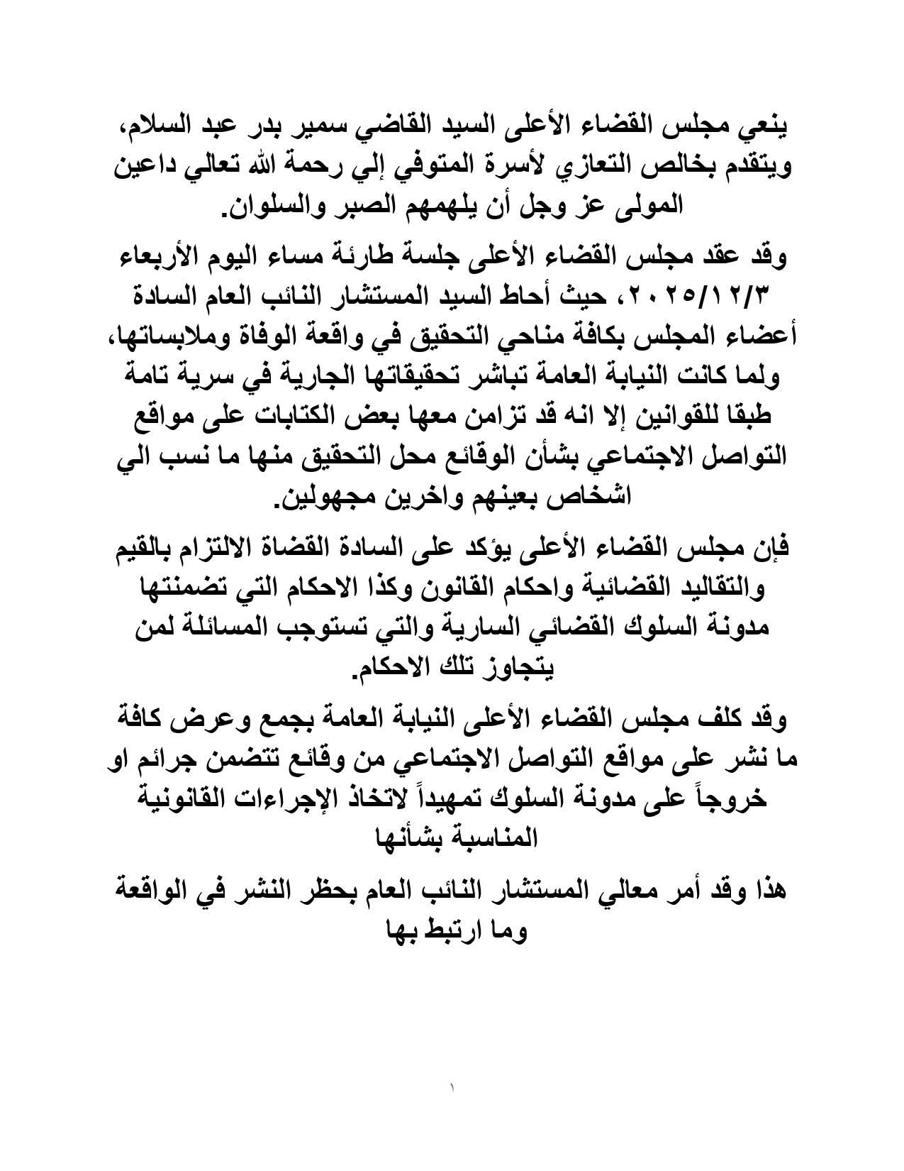 كلّف مجلس القضاء الأعلى، برئاسة المستشار عاصم الغايش، رئيس محكمة النقض، رئيس المجلس، النيابة العامة، بجمع وعرض كافة ما نُشر من وقائع على مواقع التواصل الاجتماعي، تتعلق بوفاة القاضي سمير بدر عبد السلام، ويتضمن جرائم تستوجب التحقيق، تمهيدا لاتخاذ الإجراءات القانونية المناسبة بشأنها.
