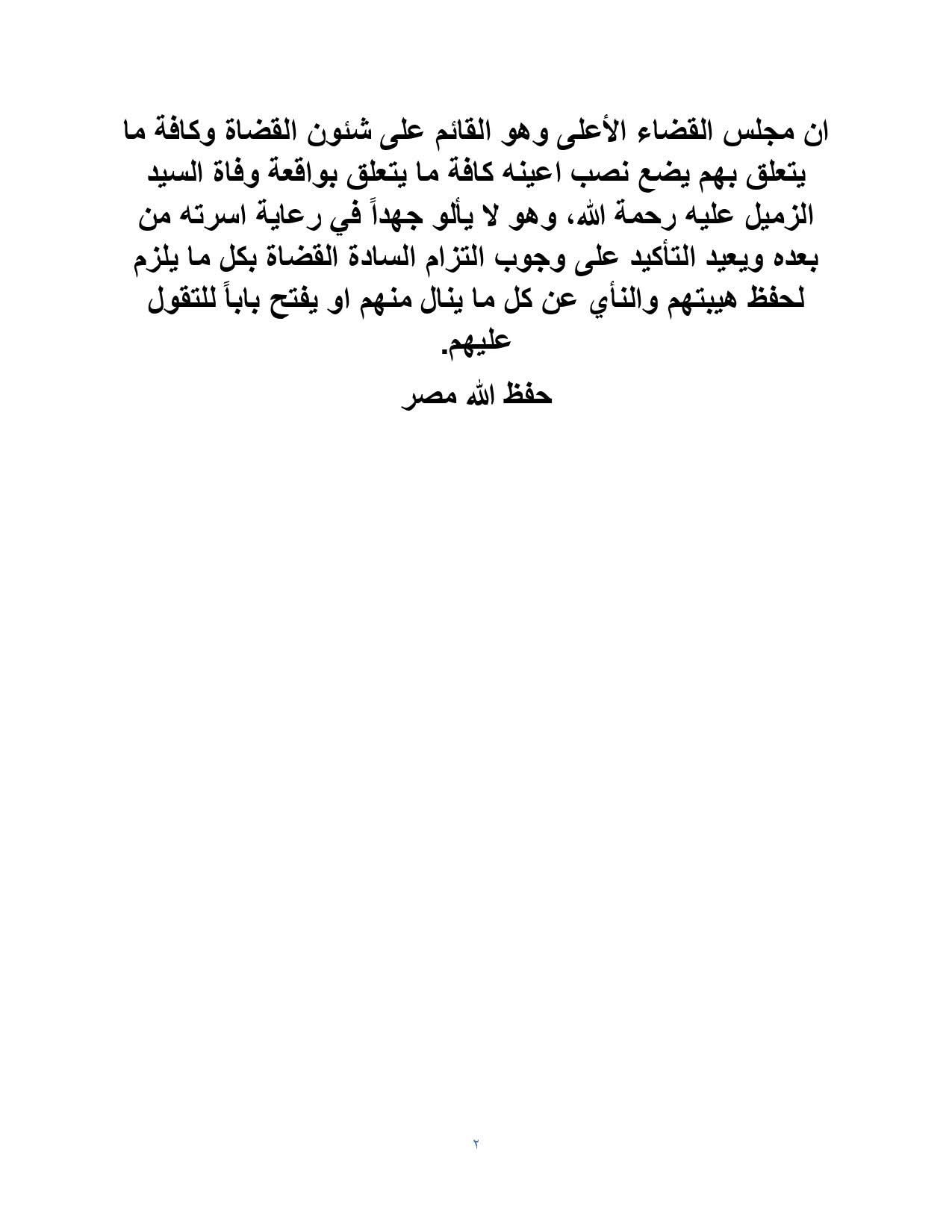 واختتم مجلس القضاء الأعلى بيانه قائلا: "إن مجلس القضاء الأعلى وهو القائم على شئون القضاة وكافة ما يتعلق بهم، يضع نصب أعينه كافة ما يتعلق بوفاة السيد الزميل عليه رحمه الله، وهو لا يألو جهدا في رعاية أسرته من بعد، ويعيد التأكيد على وجوب التزام القضاة بكل ما يلزم لحفظ هيبتهم والنأي عن كل ما ينال منهم أو يفتح بابا للتقول عليهم.. حفظ الله مصر".