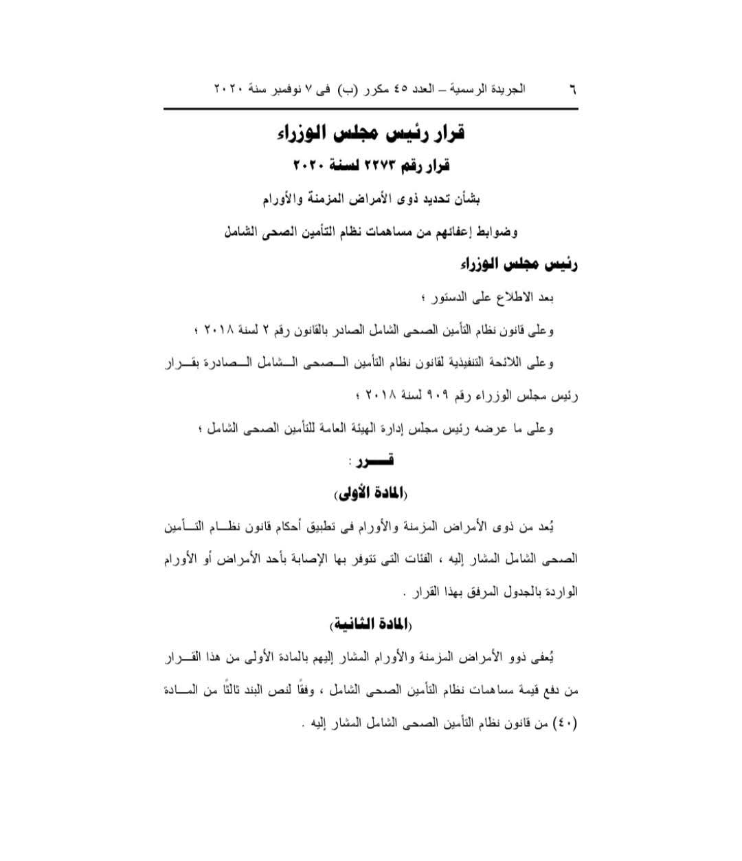 وكان الدكتور مصطفى مدبولي، رئيس مجلس الوزراء، أصدر القرار رقم 2273 لسنة 2020، حول تحديد ذوي الأمراض المزمنة والأورام، ووضع ضوابط خاصة بإعفائهم من المساهمات المالية لنظام التأمين الصحي الشامل، وجاء القرار ضمن الجهود الحكومية لتخفيف الأعباء المالية عن الفئات الأكثر احتياجا من مرضى الأمراض المزمنة والأورام، لضمان حصولهم على الرعاية الصحية اللازمة دون أعباء إضافية.