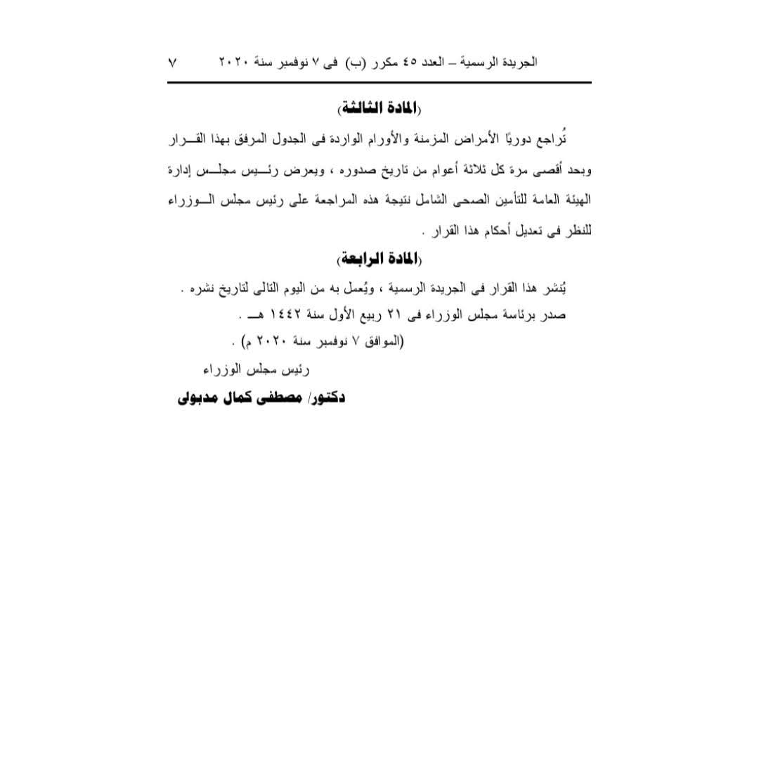 كما نص قرار رئيس مجلس الوزراء على المراجعة الدورية للأمراض المزمنة والأورام الواردة في الجدول المرفق بهذا القرار، وبحد أقصى مرة كل ثلاثة أعوام من تاريخ صدوره، على ان يعرض رئيس مجلس غدارة الهيئة العامة للتأمين الصحي الشامل نتيجة هذه المراجعة على رئيس الوزراء، للنظر في تعديل أحكام هذا القرار.