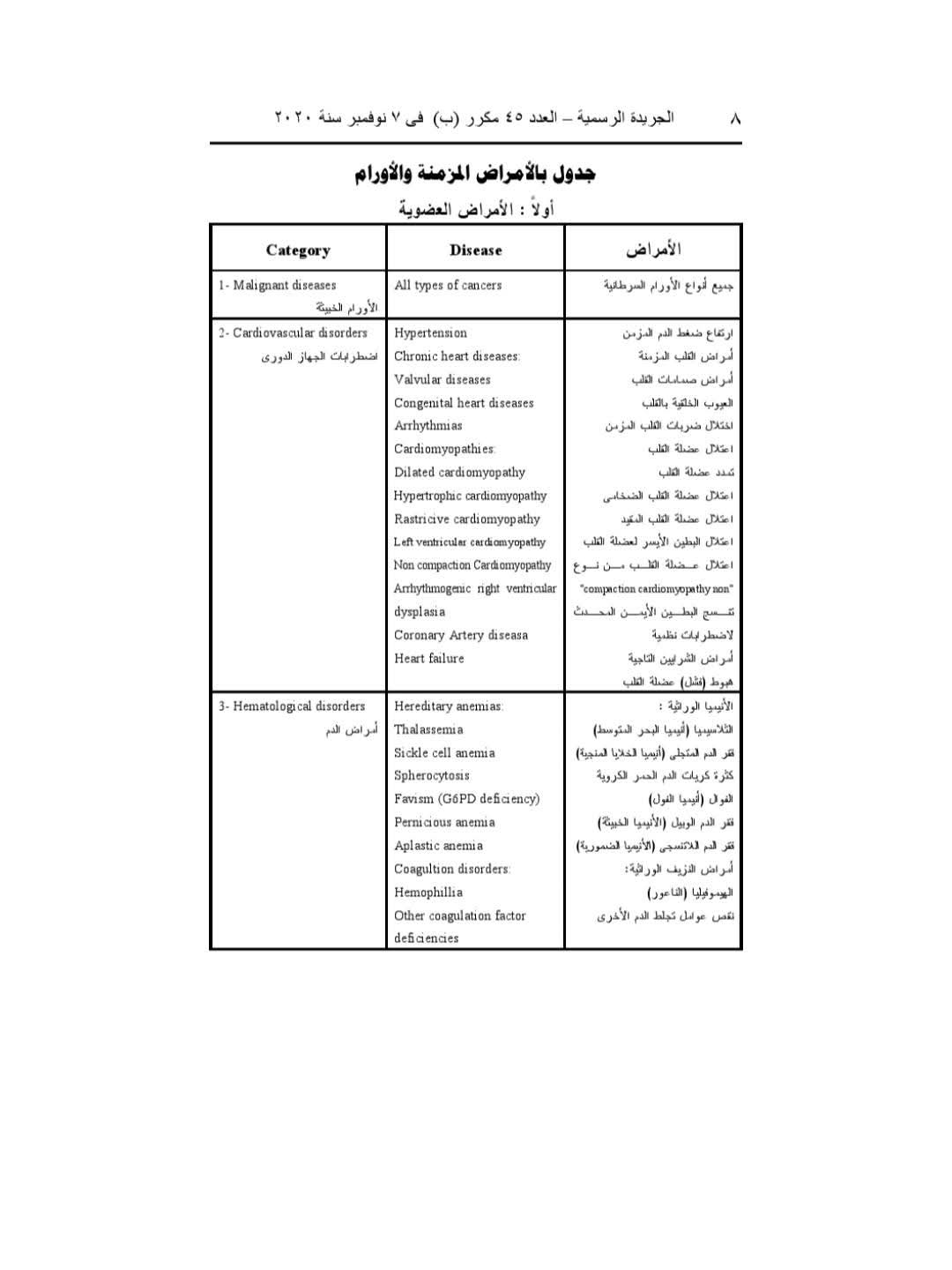 وجاءت أبرز الأمراض الواردة في القرار، جميع أنواع الأورام السرطانية، ارتفاع ضغط الدم المزمن، أمراض القلب المزمنة، أمراض صمامات القلب، العيوب الخلقية بالقلب، اختلال ضربات القلب المزمن، اعتلال عضلة القلب، تمدد عضلة القلب، اعتلال عضلة القلب الضخامي، وغيرها من أمراض القلب.