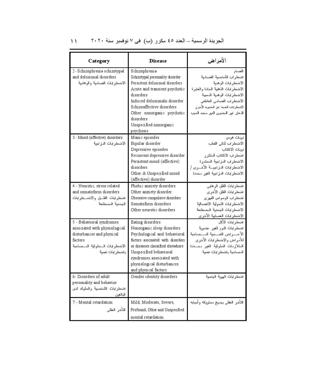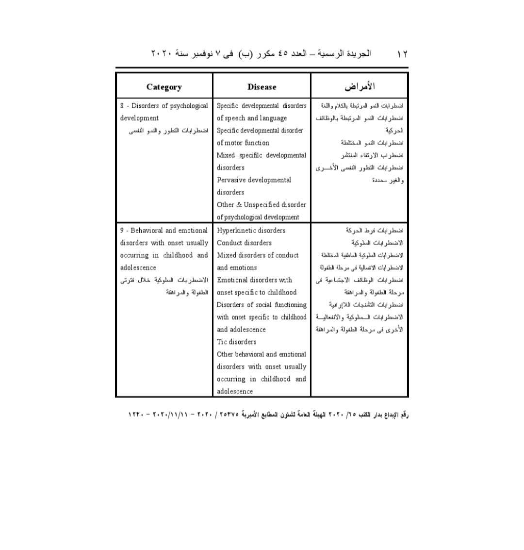 ومن بين الأمراض الواردة في القرار، الأنيميا الوراثية، وأنواعها، اضطرابات النمو المرتبطة بالكلام واللغة، اضطرابات النمو المرتبطة بالوظائف الحركية، اضطرابات النمو المختلطة، اضطراب الارتقاء المنتشر، اضطرابات التطور النفسي الأخرى وغير المحددة، اضطرابات فرط الحركة، الاضطرابات السلوكية، وغيرها من الاضطرابات.