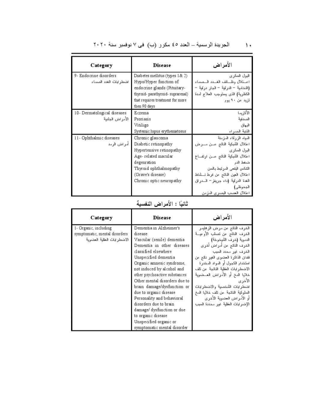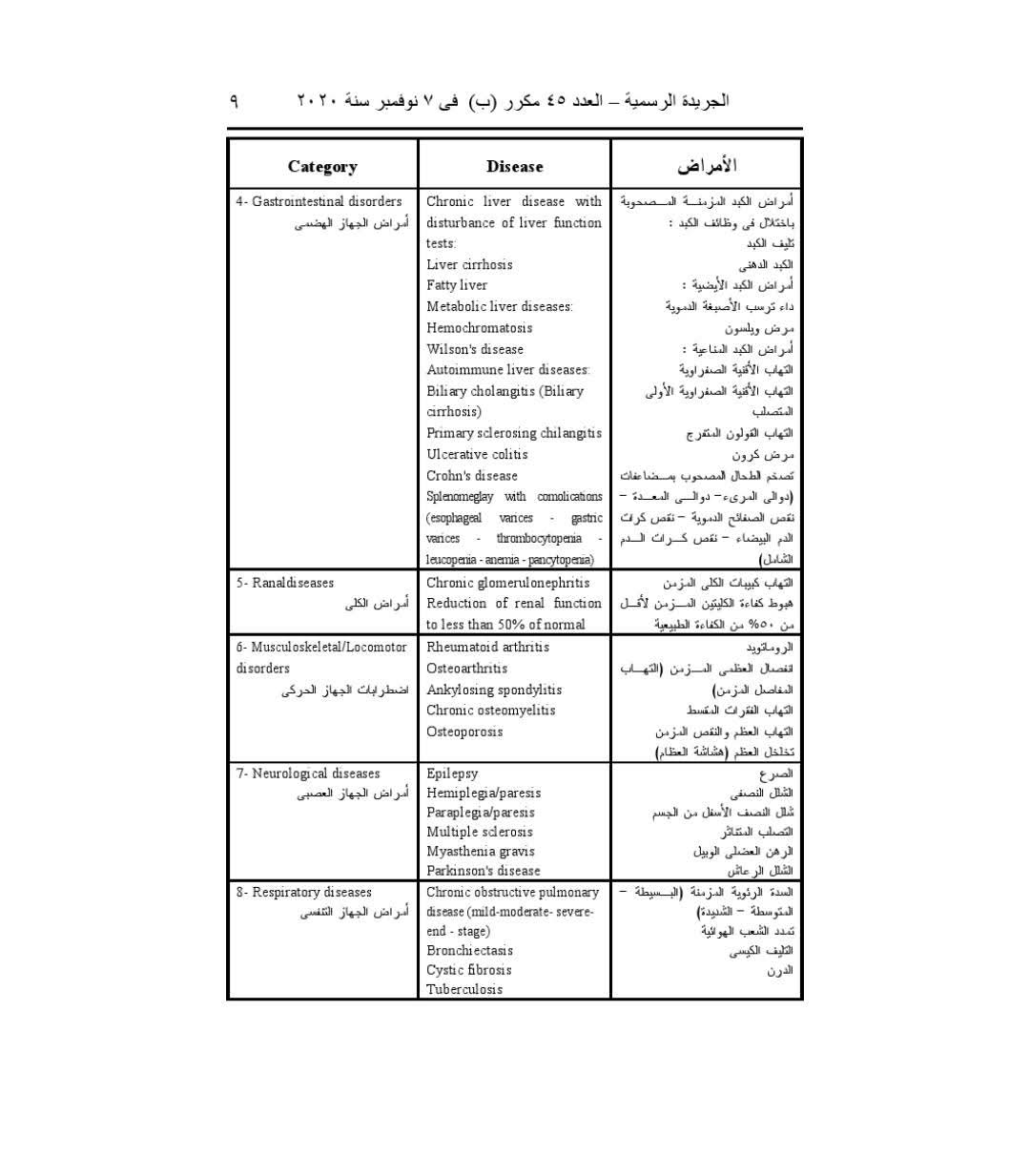 وجاء أيضا، مرض البول السكري، واعتلال وظائف الغدد الصماء بأنواعها، الذي يستوجب العلاج لمدة تزيد عن 90 يوما، والأكزيما، الصدفية، البهاق، الذئبة الحمراء، وكذلك مجموعة من أمراض الرمد، وأمراض الجهاز الهضمي، وأمراض الكلى، وغيرها.