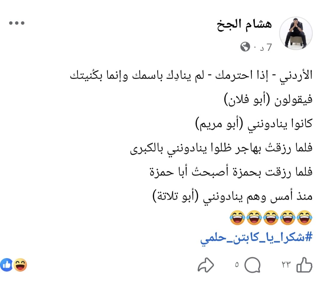 وأشار هشام الجخ إلى أن تكرار الأزمات الإدارية، وكثرة تغيّر الأجهزة الفنية بشكل متلاحق، والضغوط على اللاعبين، كلها عوامل انعكست على الأداء داخل الملعب والدليل الهزيمة الثقيلة التي تلقاها المنتخب امام الأردن ثلاثة اهداف نظيفة ولولا ستر ربنا لارتفعت النتيجة لرقم أعلى، وهو ما دفعه لكتابة كلمات ساخرة قال فيها: الأردني إذا احترمك لم ينادِك باسمك وإنما بكُنيتك، فيقولون (أبو فلان) وكانوا ينادونني (أبو مريم)، فلما رزقت بحمزة أصبحتُ أبا حمزة، فلما رزقتُ بهاجر ظلوا ينادونني بالكبرى، ومنذ أمس وهم ينادونني (أبو تلاتة).