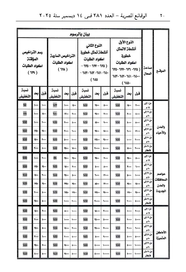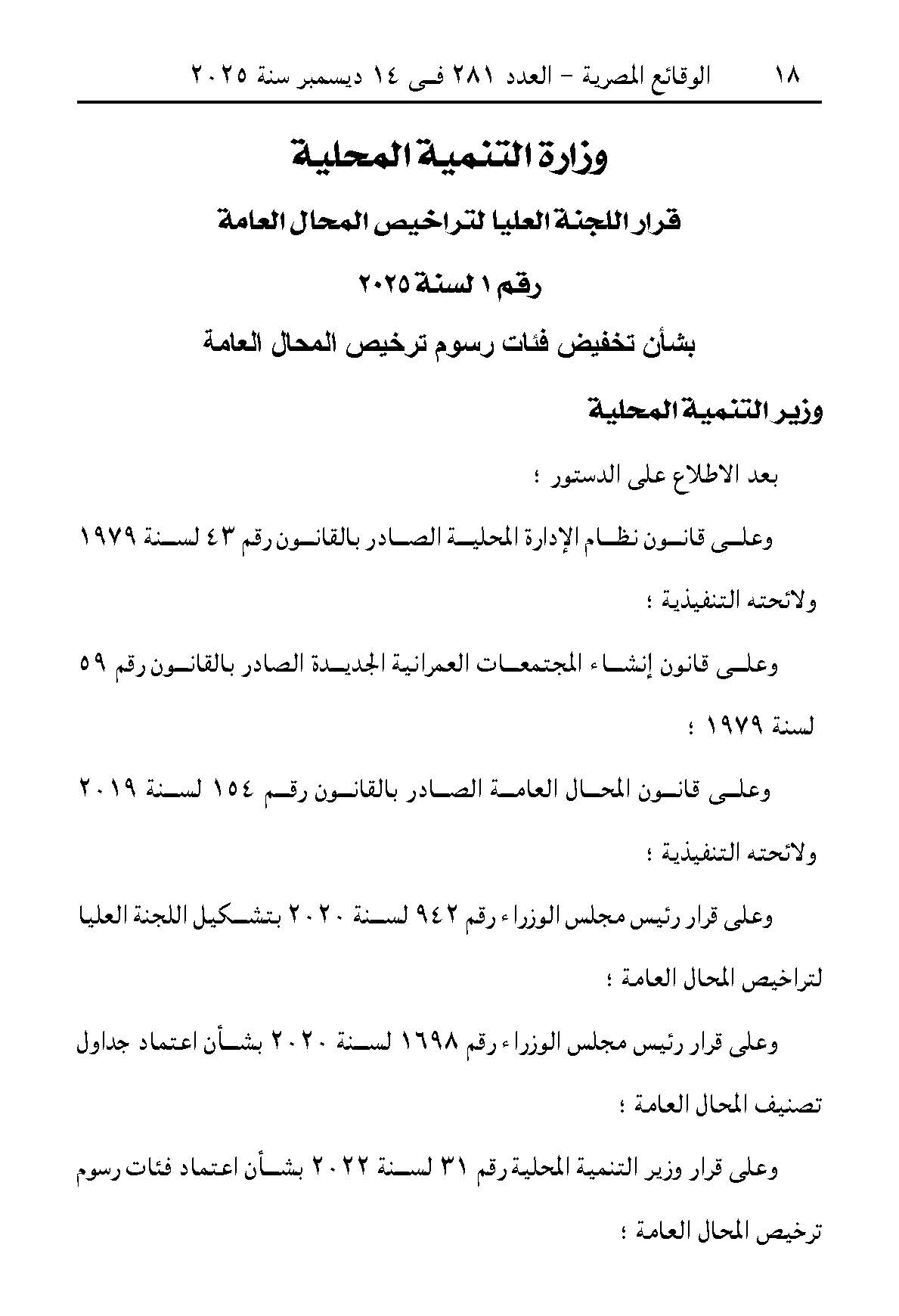 نشرت الوقائع المصرية في العدد رقم 281 في 14 ديسمبر سنة 2025، قرار اللجنة العليا لتراخيص المحال العامة بوزارة التنمية المحلية، رقم 1 لسنة 2025 بشأن تخفيض فئات رسوم ترخيص المحال العامة، مع تقسيمها طبقا للموقع، والمدن والأحياء، وعواصم المحافظات والمدن الجديدة، والأماكن المتميزة، وحسب مساحة المحال.