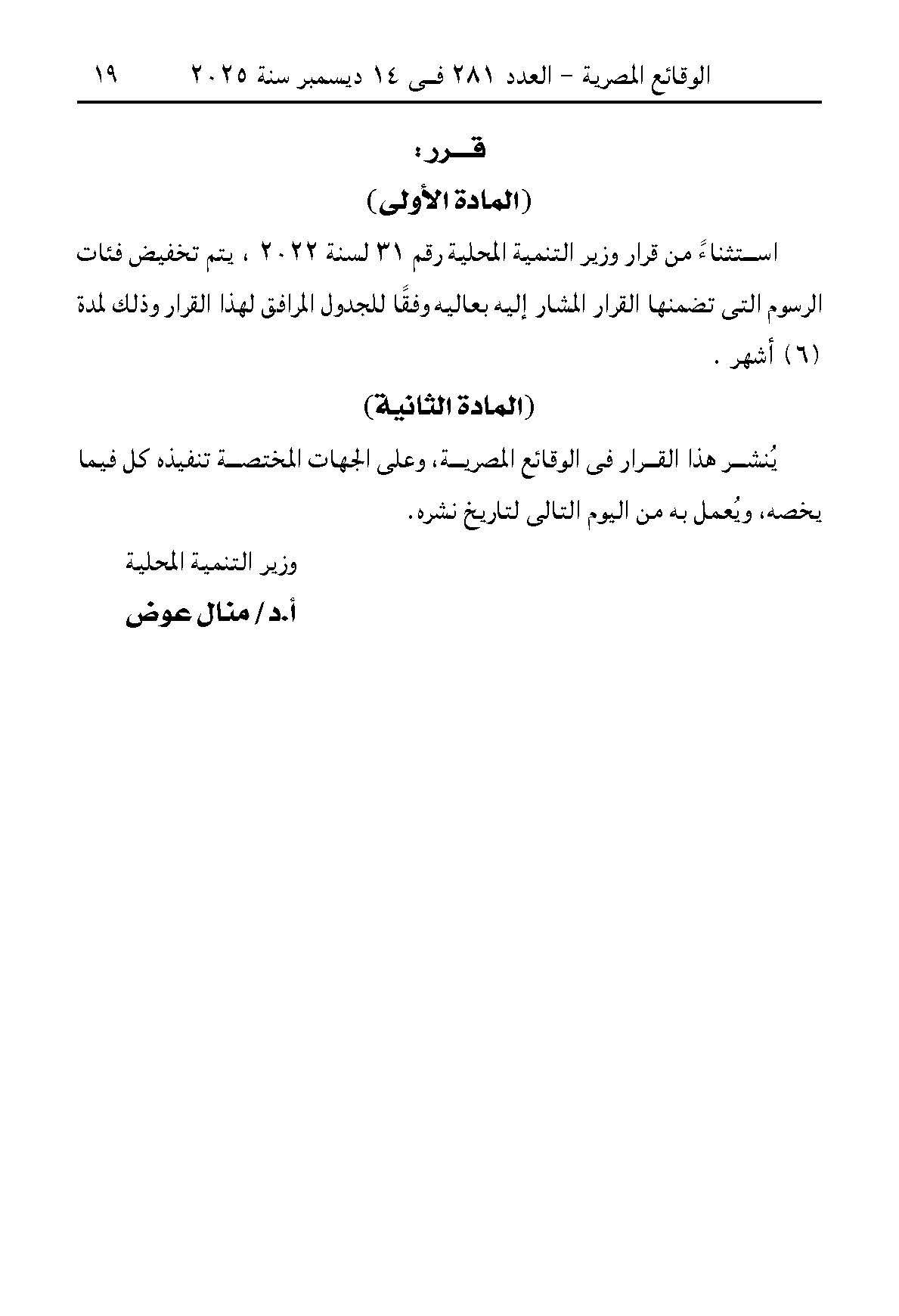 ونص قرار اللجنة العليا لتراخيص المحال العامة بوزارة التنمية المحلية، في المادة الأولى، على: استثناء من قرار وزير التنمية المحلية رقم 31 لسنة 2022، يتم تخفيض فئات الرسوم التي تضمنها القرار المشار إليه بعاليه وفقا للجدول المرافق لهذا القرار وذلك لمدة 6 أشهر، ونص في المادة الثانية، على أن ينشر هذا القرار في الوقائع المصرية، وعلى الجهات المختصة تنفيذه كل فيما يخصه، ويعمل به من اليوم التالي لتاريخ نشره.