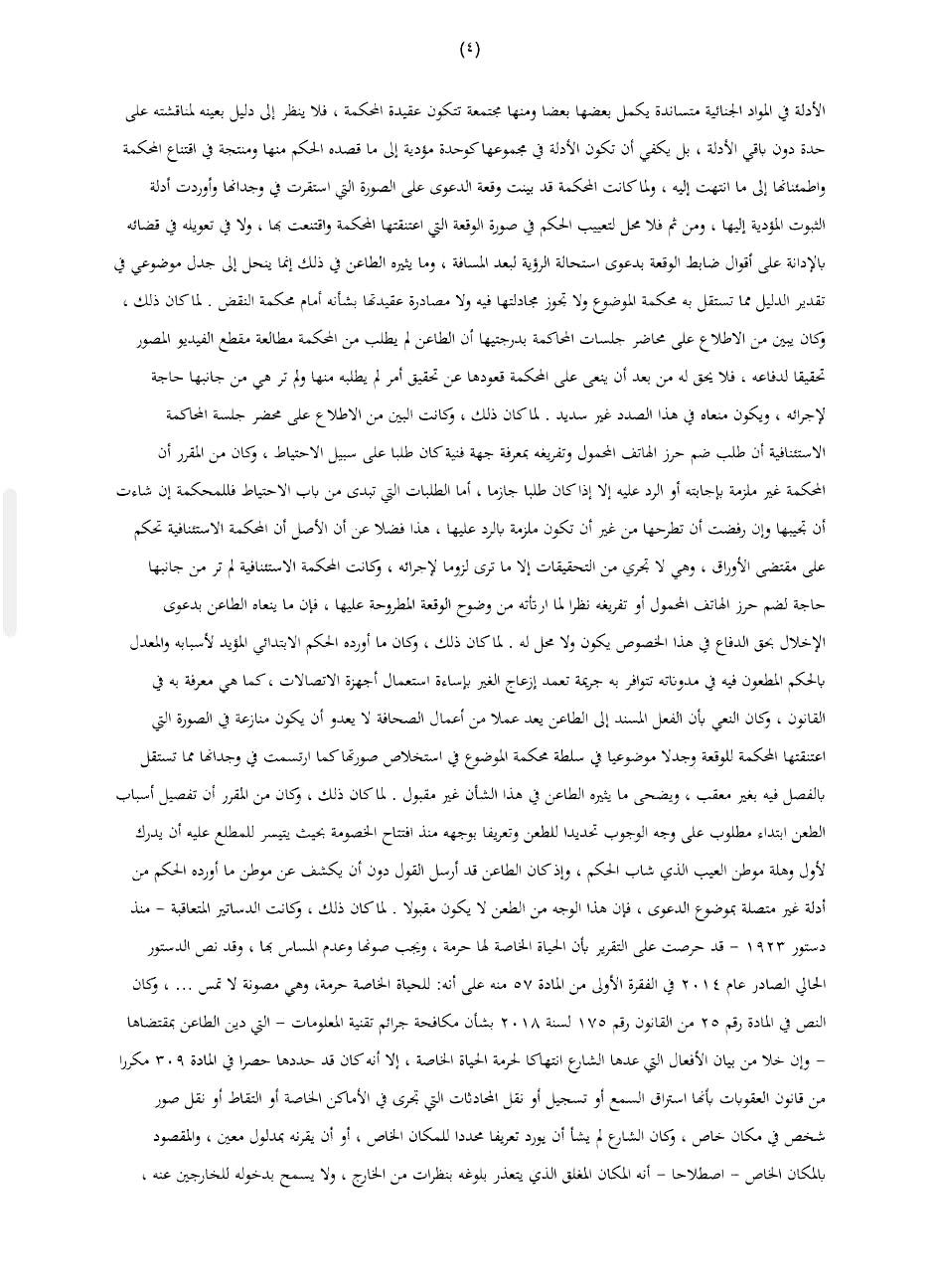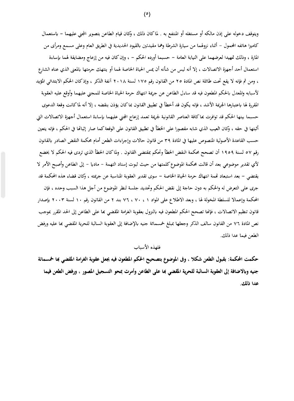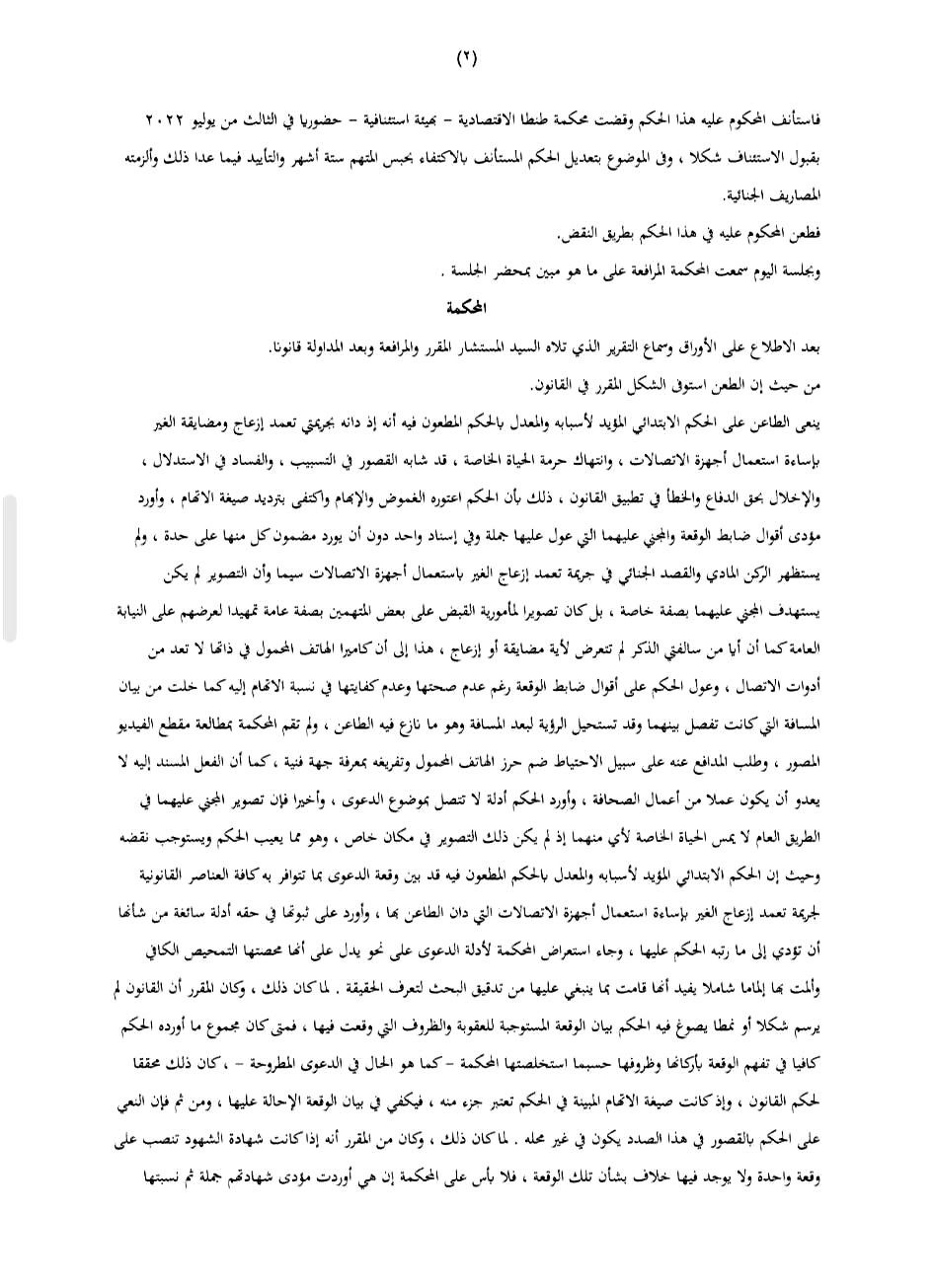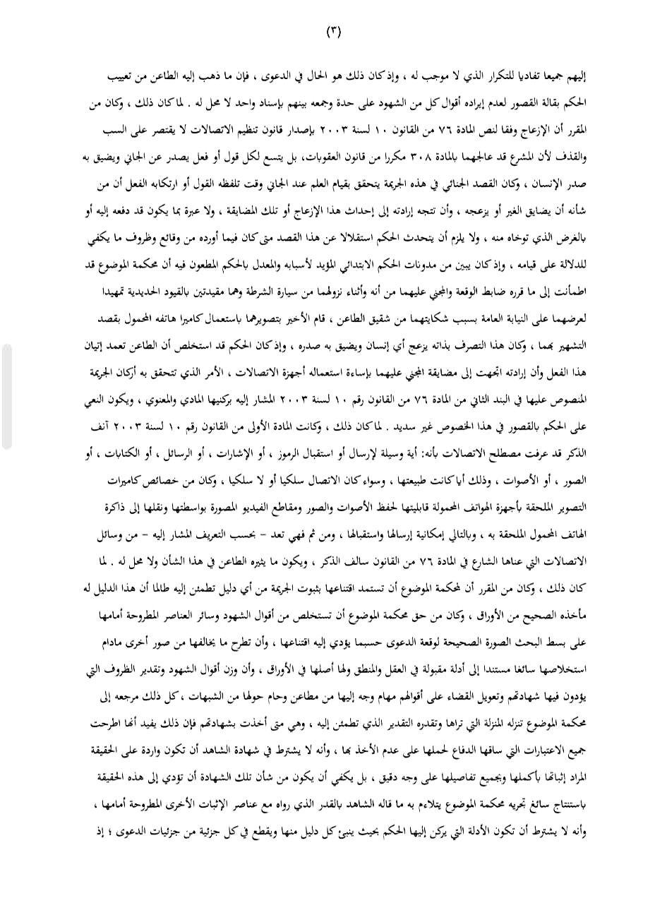 وجاءت كل هذه المبادئ القضائية، في الدعوى التي اتهمت فيها النيابة العامة الطاعن، بأنه صور المجني عليهما أثناء نزولهما من سيارة الشرطة مقيدين، بقصد التشهير بهما، وهو ما يشكل تعمد إزعاجهما بإساءة استعمال أجهزة الاتصالات وانتهاك حرمة الحياة الخاصة، وذلك في الطريق العام.