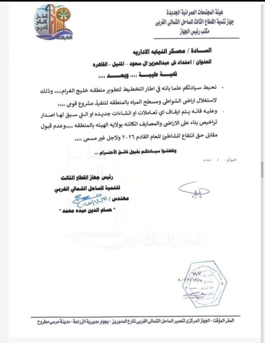 كشف خطاب صادر من جهاز تنمية القطاع الثالث لـ الساحل الشمالى الغربى التابع لهيئة المجتمعات العمرانية الجديدة موجه الى النيابة الإدارية لوقف كافة الانشاءات الجديدة او اى تعاملات مستقبلية بالاضافة الى وقف اى تعاملات سبق وأن قام الجهاز بإصدار تراخيص بناء للاراضى و المصايف الكائنة بولاية الهيئة داخل المنطقة .. وكذلك عدم قبول مقابل حق الانتفاع السنوى للشاطئ للعام القادم 2026 وذلك لاجل مسمى.