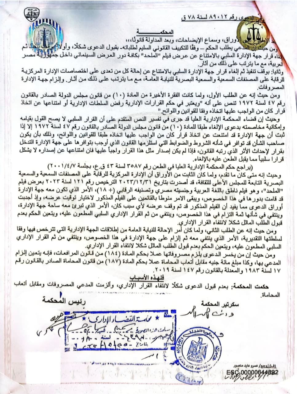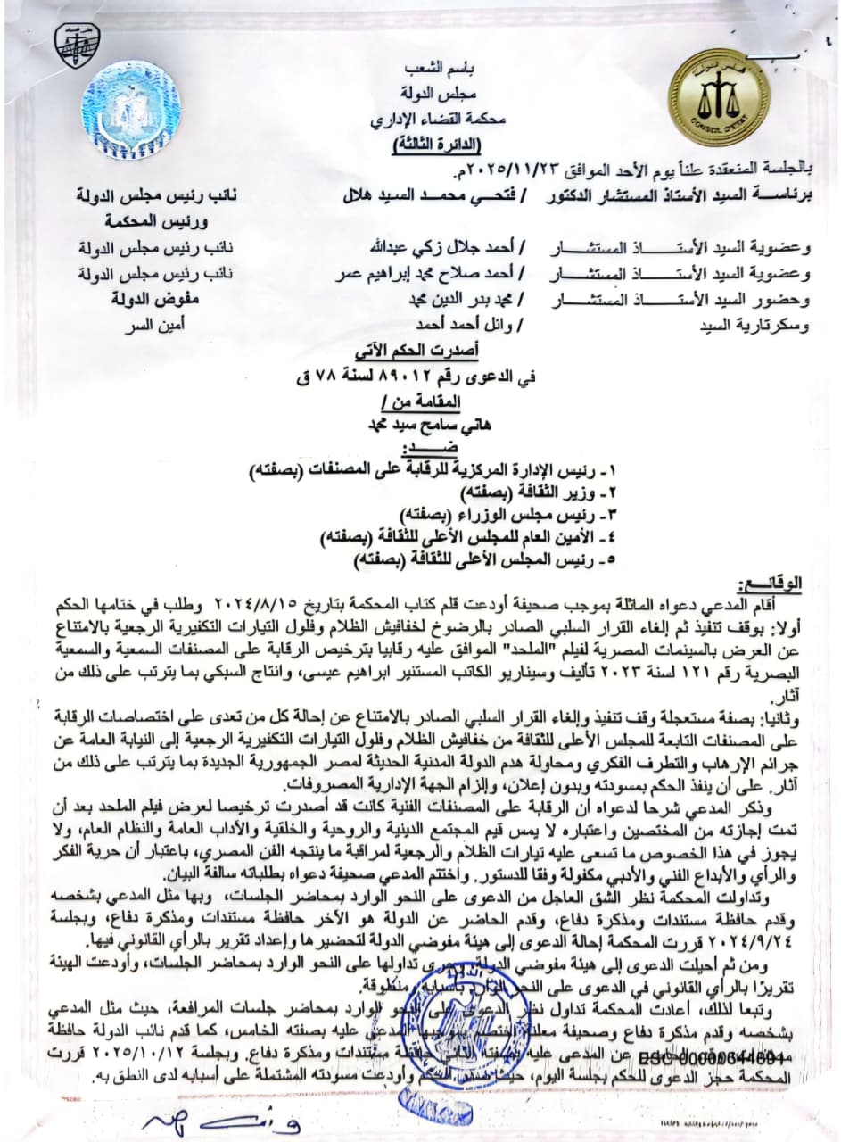 وقضت محكمة القضاء الإداري أيضا، بعدم قبول الدعوى المقامة من الدكتور هاني سامح لانتفاء القرار الإداري، وذلك بعد تقديم وزارة الثقافة والمجلس الأعلى للثقافة ما يفيد بصدور الترخيص الرسمي لعرض الفيلم من الرقابة على المصنفات السمعية والبصرية تحت رقم (121) لسنة 2023، ما يعني وجود قرار إداري إيجابي بإجازة العرض، ومن ثم تنتفي مصلحة الطاعن في طلب الإلزام.