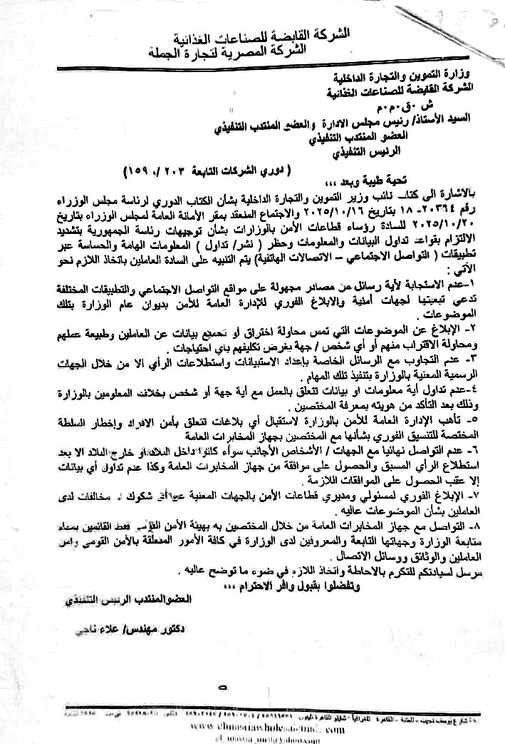 في خطوة تعكس تشديد الرقابة على تداول المعلومات داخل وزارة التموين، أصدرت الشركة القابضة للصناعات الغذائية التابعة للوزارة، منشوراً إدارياً يضع قيوداً صارمة على تواصل العاملين مع الجهات الخارجية واستخدام تطبيقات التواصل الاجتماعي.
