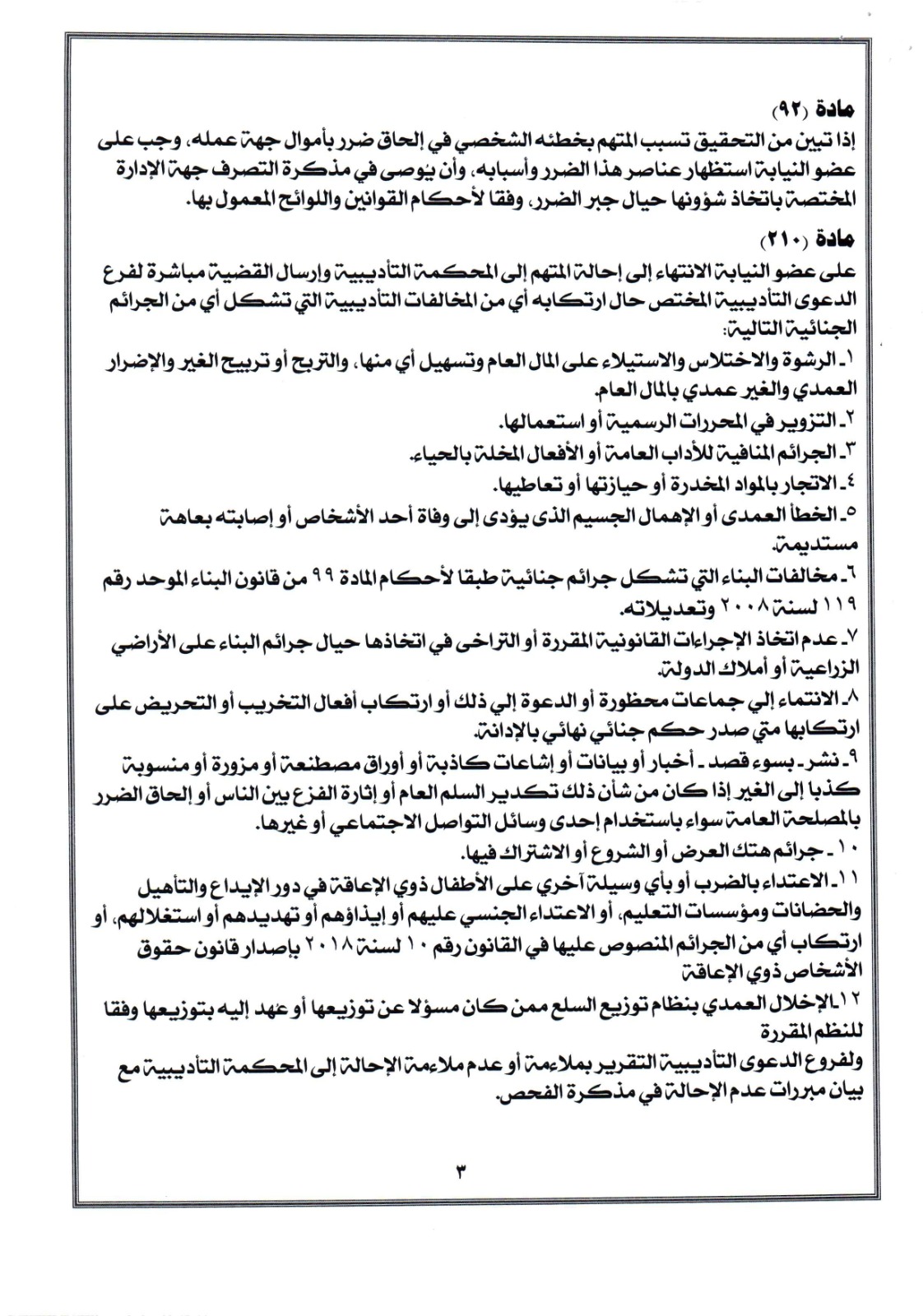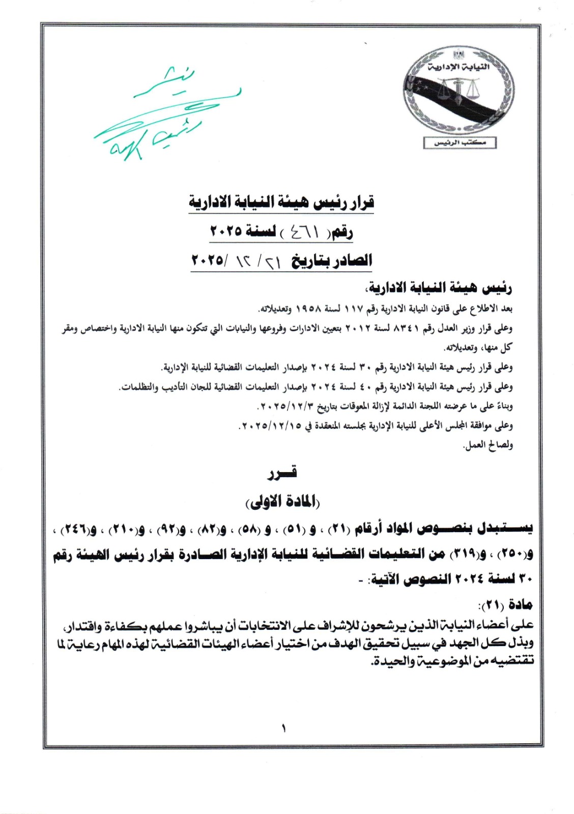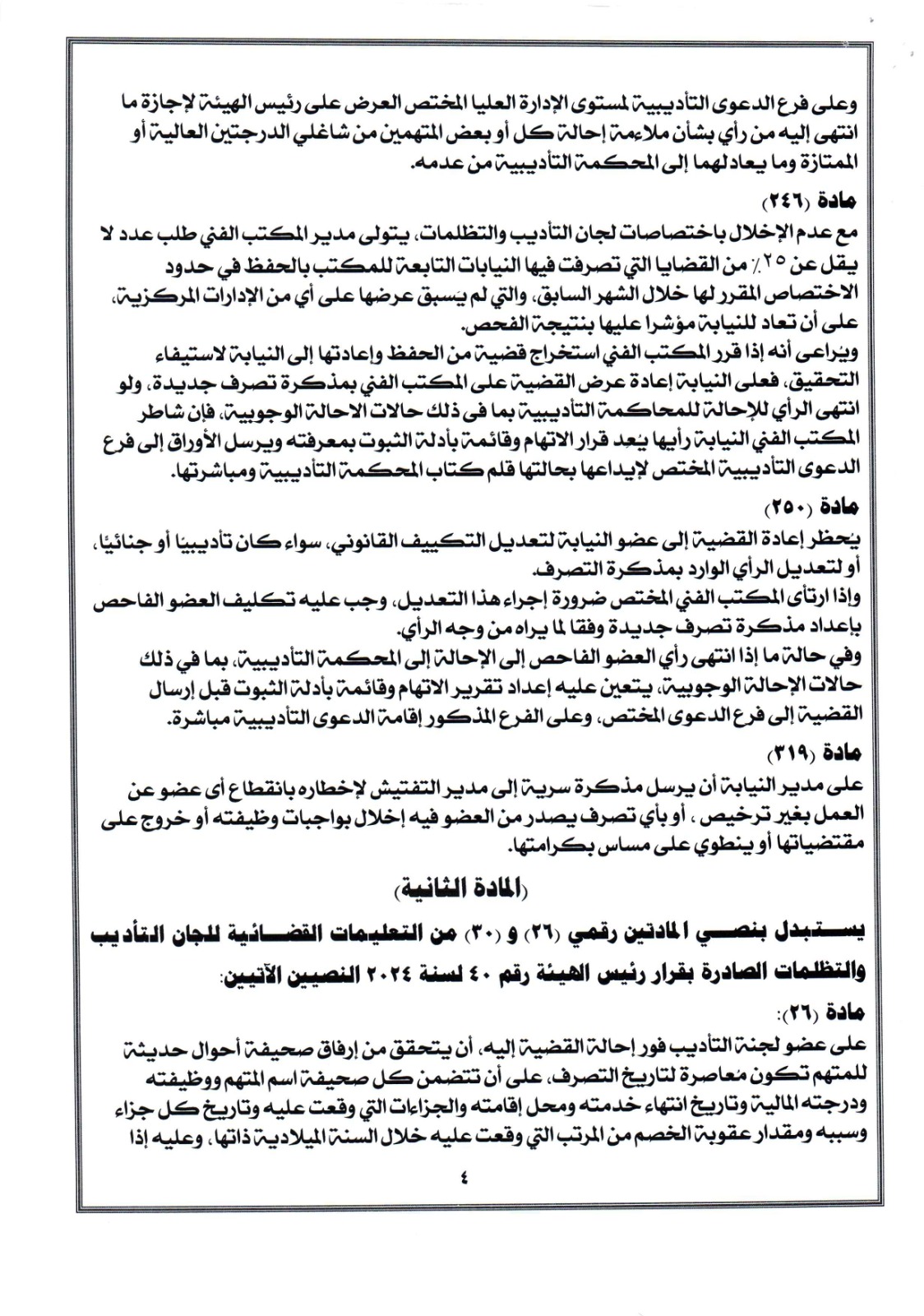 قرر (المادة الاولى) يستبدل بنصوص المواد أرقام (۲۱) ، و (٥١) ، و (٥٨) ، و (۸۲) ، و(۹۲) ، و (۲۱۰) ، و (٢٤٦) ، و(٢٥٠) ، و (۳۱۹) من التعليمات القضائية لـ النيابة الإدارية الصادرة بقرار رئيس الهيئة رقم ٣٠ لسنة ٢٠٢٤ النصوص الآتية: