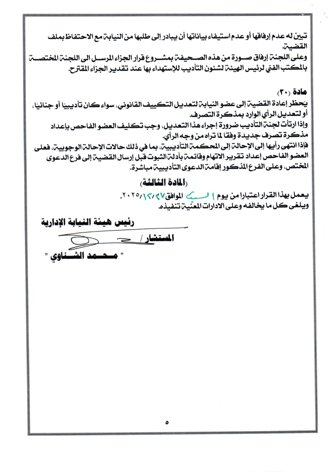 وعلى قرار رئيس هيئة النيابة الادارية رقم ۳۰ لسنة ۲۰۲٤ بإصدار التعليمات القضائية لـ النيابة الإدارية. وعلى قرار رئيس هيئة النيابة الإدارية رقم ٤٠ لسنة ۲۰۲٤ بإصدار التعليمات القضائية للجان التأديب والتظلمات. وبناءً على ما عرضته اللجنة الدائمة لإزالة المعوقات بتاريخ 1 وعلى موافقة المجلس الأعلى للنيابة الإدارية بجلسته المنعقدة في ٢٠٢٥/١٢/١٥. ولصالح العمل.