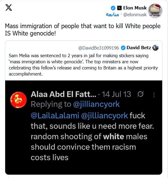 وشارك المليادير الأمريكي إيلون ماسك في حملة الانتقادات التي وجهت إلى الترحيب بعودة علاء عبد الفتاح إلى بريطانيا، وكتب على إحدى تغريدات الناشط: “الهجرة الجماعية للأشخاص الذين يريدون قتل البيض هي إبادة جماعية للبيض!”.